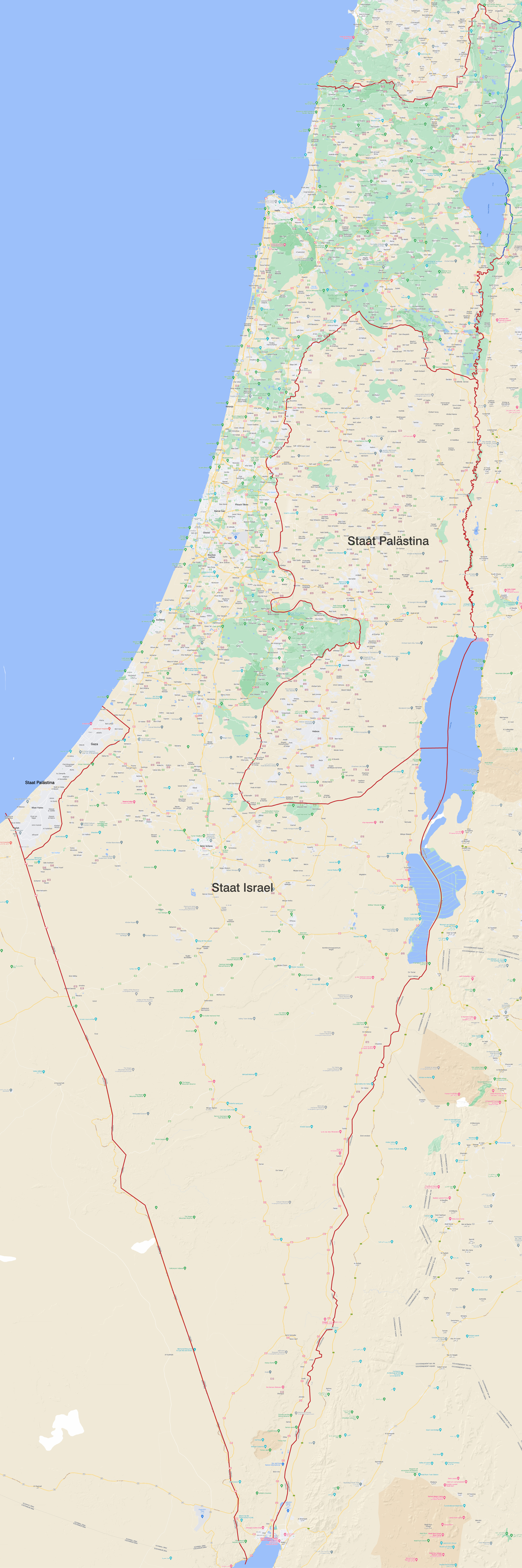 The borders between Israel and the neighbouring states were highlighted in red. The border between the State of Israel and the State of Palestine was treated as a recognised state border. The course of the border follows the armistice lines, where these do not have a clear course, the border runs approximately in the centre.