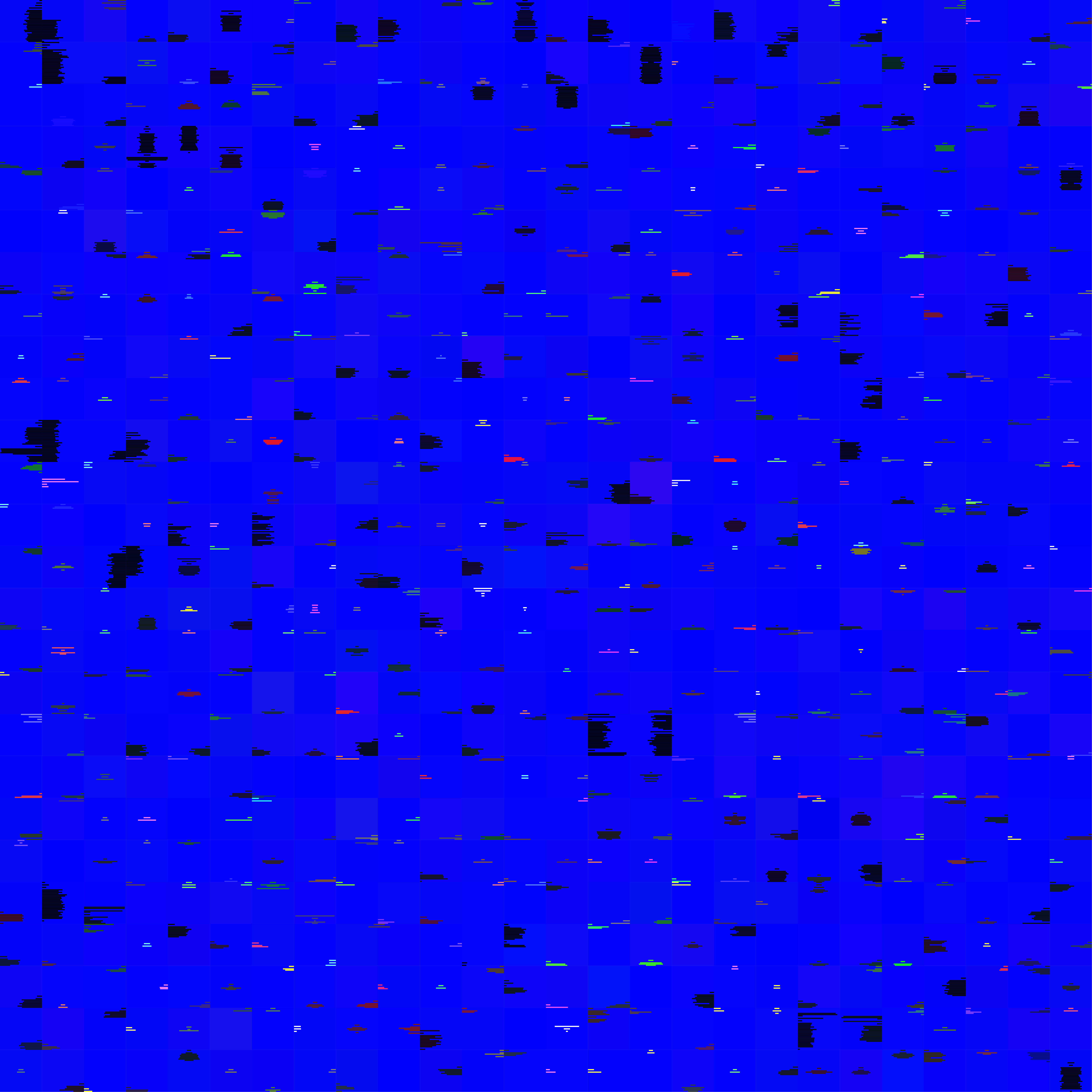 Pericles, Prince of Tyre contains 647 text blocks according to the general set of rules (639 speaker-based and 8 blocks created by division, as the text contains more than 34 lines). The number of tiles of the work is determined (due to the defined quadratic work) by the root of the text blocks rounded up to an integer. This results in 26 x 26 = 676 tiles. The resulting 29 tiles not occupied by text are created with the basic colour of the work 0-0-255 blue and inserted every 23 tiles, beginning at the 16th position.
