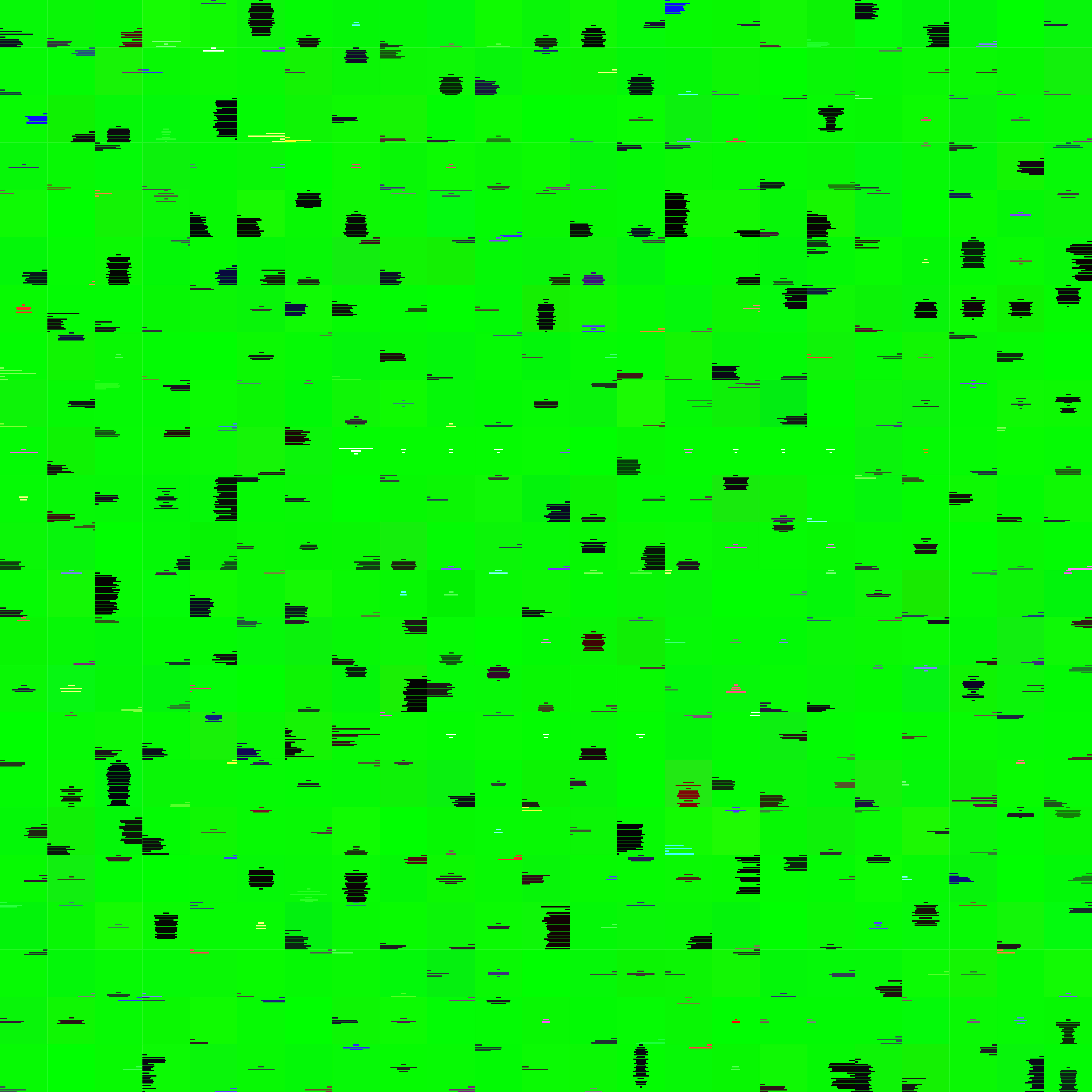 A Midsummer Night's Dream contains 501 text blocks according to the general set of rules (500 speaker-based and 1 block created by division, as the text contains more than 34 lines). The number of tiles of the work is determined (due to the defined quadratic work) by the root of the text blocks rounded up to an integer. This results in 23 x 23 = 529 tiles. The resulting 28 tiles not occupied by text are created with the basic colour of the work 0-255-0 green and inserted every 18 tiles, beginning at the 22nd position.