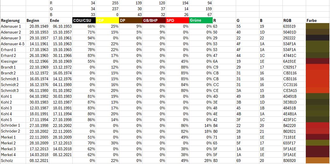 To determine the respective "government colour", the election results of the parties involved in the government under review are used. The government colour is calculated by determining the percentage share of each governing party in the government and multiplying the party's colour values for R, G, B by this. This is used to create the changes to the laws of the active government.