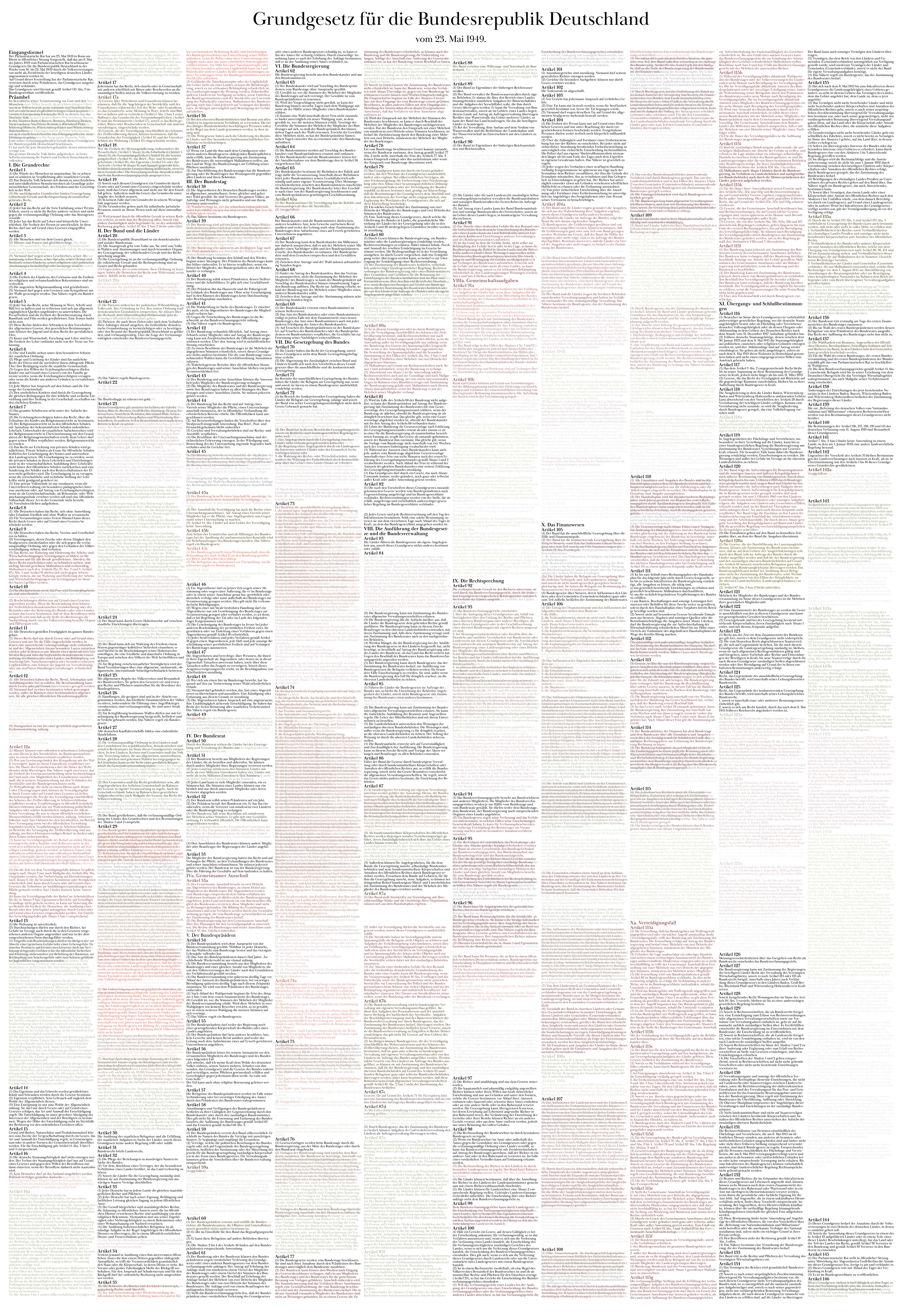 Source for the legal texts of the respective versions of the Basic Law I use the rtf download from DocPatch at https://gg.docpatch.org/#herunterladen for the amendments up to and including the amending law of April 2019 (many thanks for your effort, would have expected the same from bundestag.de, but there you can view pdf scans that look like being faxed). To determine the amended articles compared to the previous version, I use the list of amendments according to Änderungsgesetze Grundgesetze. The texts linked here were used for the amendment laws 64 to 67. (Of course, this is not a scientific, but an artistic work, so I, as well as DocPatch, take no responsibility for the accuracy of the texts).