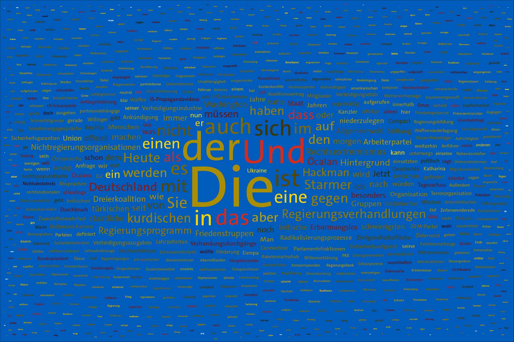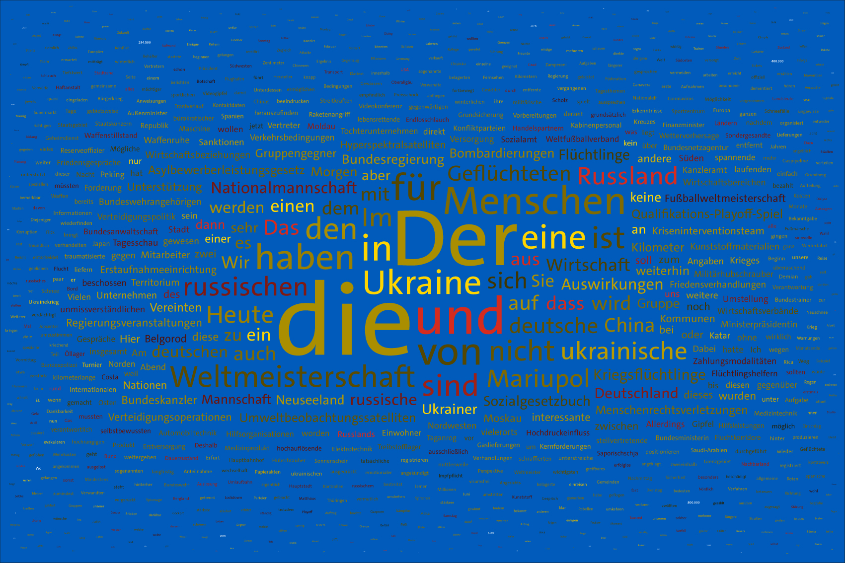 For the font colours, the individual words are assigned to the colour rules for the warring parties. For this purpose, the number of occurrences of the letters of the country names of the warring parties in the respective word is counted. For the Ukraine, the occurrences of the letters u, k, r, a, i, n, e, for the aggressor Russia the letters r, u, s, l, a, n, d (the s is only counted once) are evaluated. The word is assigned to the colour rule that scores the higher value. In case of a tie, the rule for Ukraine is applied. If there is no letter of the warring parties, the value is white (FFFFFF).