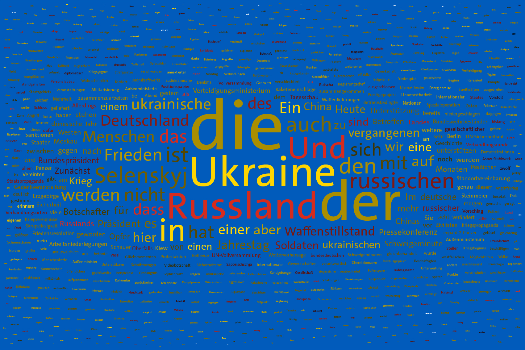 Tag 1400 im Werk zur Dokumentation der Berichterstattung über den Krieg in der Ukraine seit 2022 durch Wertung der Worte in Nachrichtensendungen und deren regelbasierte, farbliche Zuordnung zu den Kriegsparteien in bildlicher Form. Bildhintergrund im blau der ukrainischen Flagge.