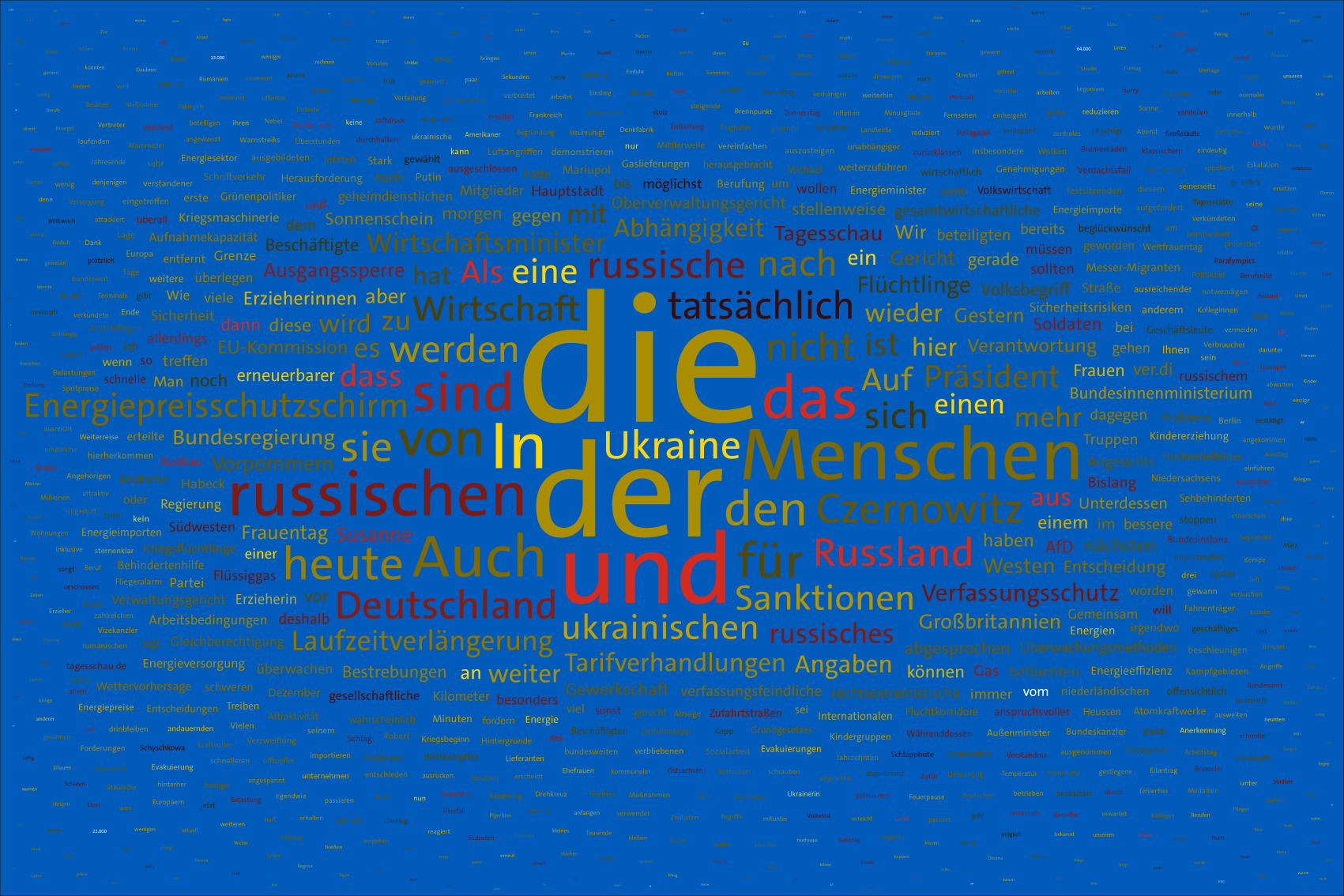 Tag 6 im Werk zur Dokumentation der Berichterstattung über den Krieg in der Ukraine 2022 durch Wertung der Worte in Nachrichtensendungen und deren regelbasierte, farbliche Zuordnung zu den Kriegsparteien in bildlicher Form. Bildhintergrund im blau der ukrainischen Flagge.