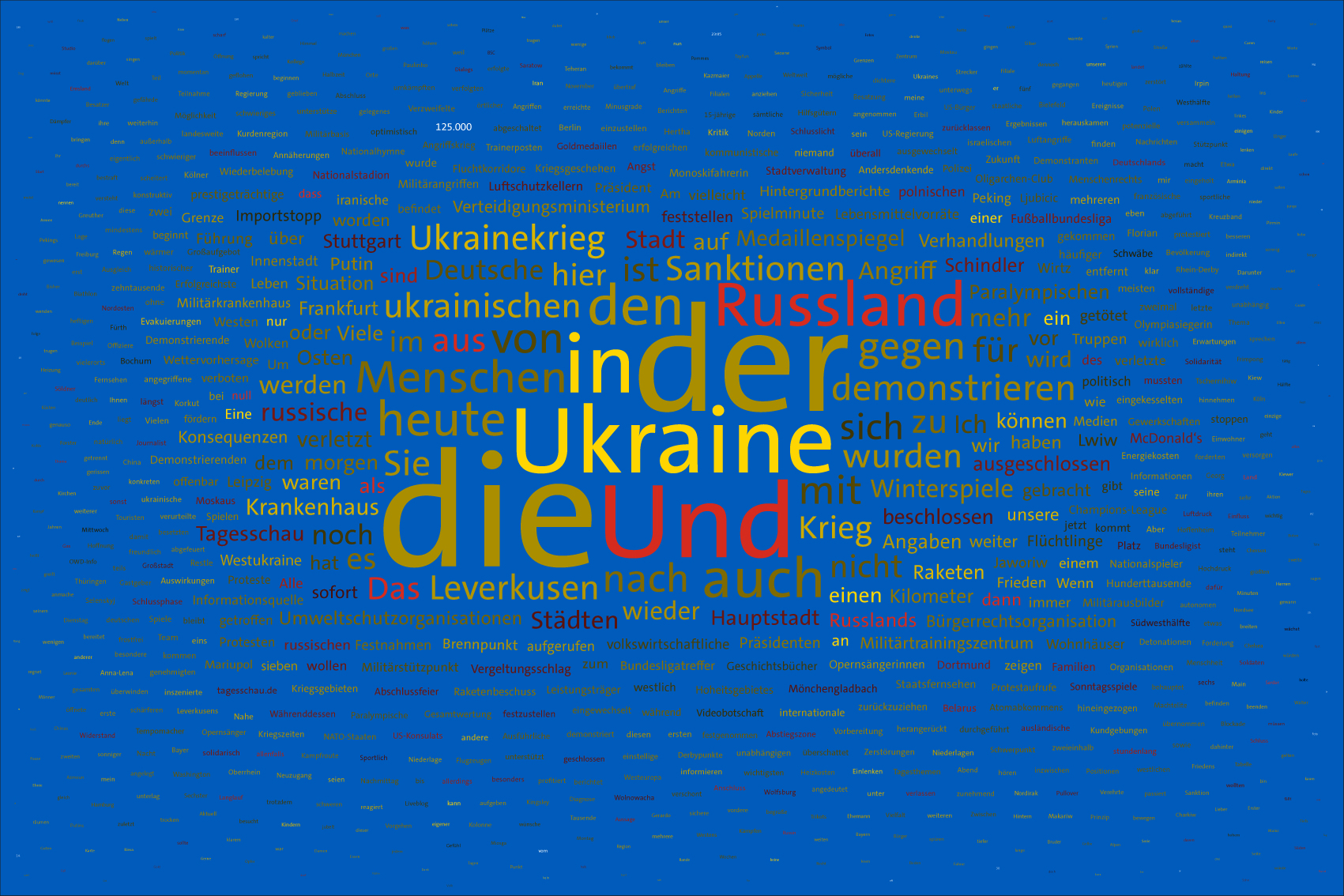 Tag 1 im Werk zur Dokumentation der Berichterstattung über den Krieg in der Ukraine 2022 durch Wertung der Worte in Nachrichtensendungen und deren regelbasierte, farbliche Zuordnung zu den Kriegsparteien in bildlicher Form. Bildhintergrund im blau der ukrainischen Flagge.