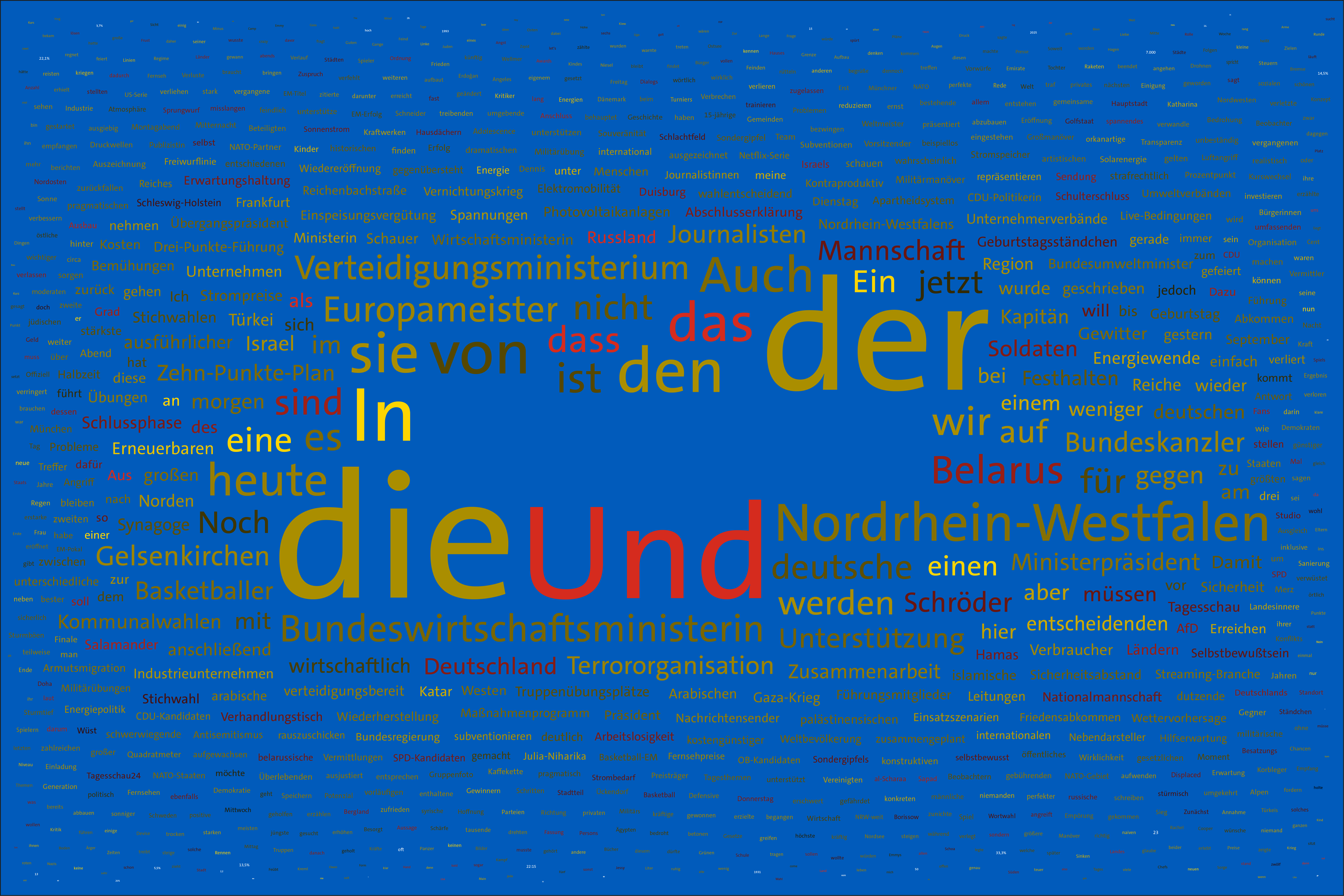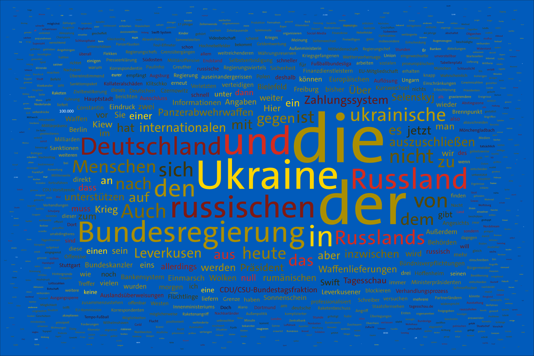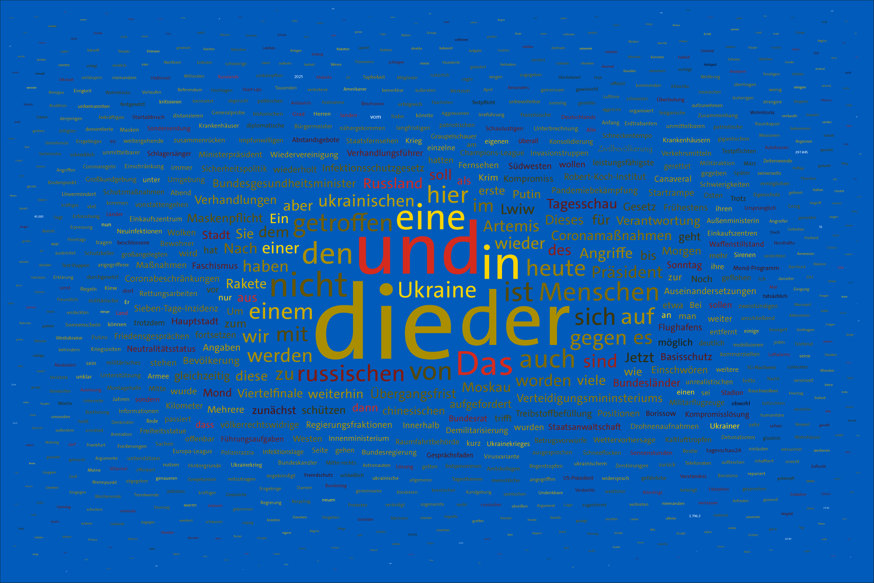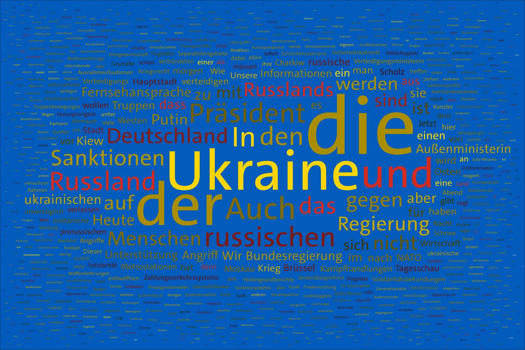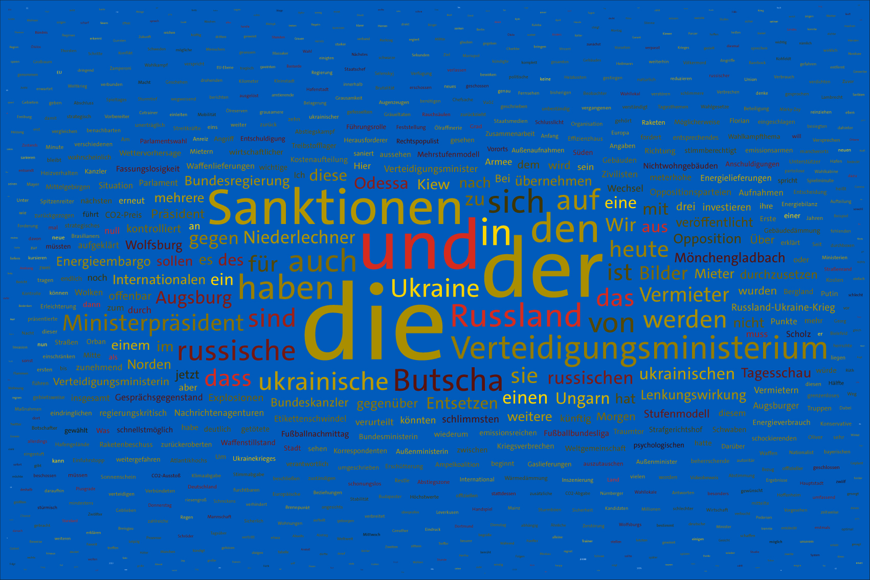 Tag 1400 im Werk zur Dokumentation der Berichterstattung über den Krieg in der Ukraine seit 2022 durch Wertung der Worte in Nachrichtensendungen und deren regelbasierte, farbliche Zuordnung zu den Kriegsparteien in bildlicher Form. Bildhintergrund im blau der ukrainischen Flagge.