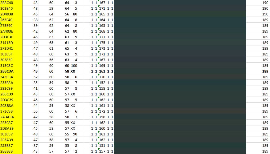 Für eine Gruppierung werden die Farbwerte nach Helligkeit zunehmend sortiert. Um eine genäherte optische Sortierung zu ermöglichen ist eine rein numerische Betrachtung der Werte für R, G und B nicht ausreichend. Die einzelnen Farbwerte werden mit folgender Formel angepasst (hier am Beispiel „Rot“: WENN(„Rot“<=60;63-„Rot“;0)+ „Rot“). Die Werte für Rot, Blau, Grün werden addiert, das Ergebnis auf ganze 10er gerundet und diese gruppiert. Es ergeben sich 27 Farbgruppen, welche zwischen 1 und 109 einzelne Farbwerte umfassen.