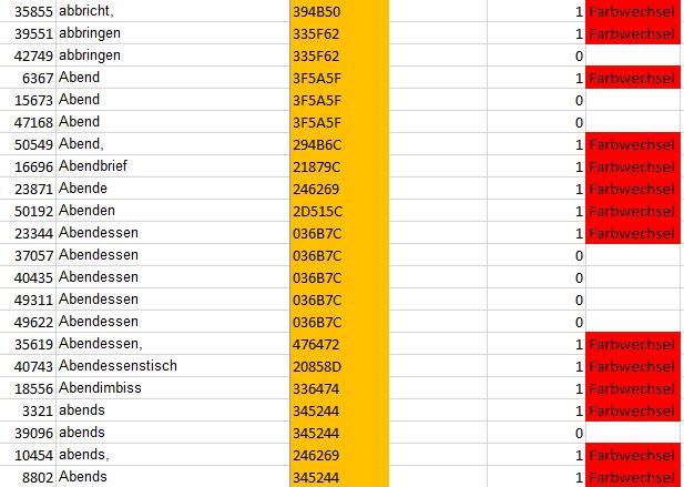 Über die Funktion "Suchen und Ersetzen" wurden im Textblock durch das Ersetzen des Textes mit sich selbst, aber Zuordnung des im Regelwerk definierten Farbwerts, die einzelnen Worte eingefärbt. Der Text enthält 6.335 verschiedene Worte (Definition: Wort im Text normalisiert durch Kleinschreibung). Da das Regelwerk Satzzeichen dem Wort zuordnet, Worte am Satzanfang in Großschreibung sein können und Wörter mehreren Farbwerten zugeordnet sein können, da die Worthäufigkeit größer ist, als eine Farbwerthäufigkeit mussten 9.202 einzelne Ersetzungsvorgänge durchgeführt werden.
