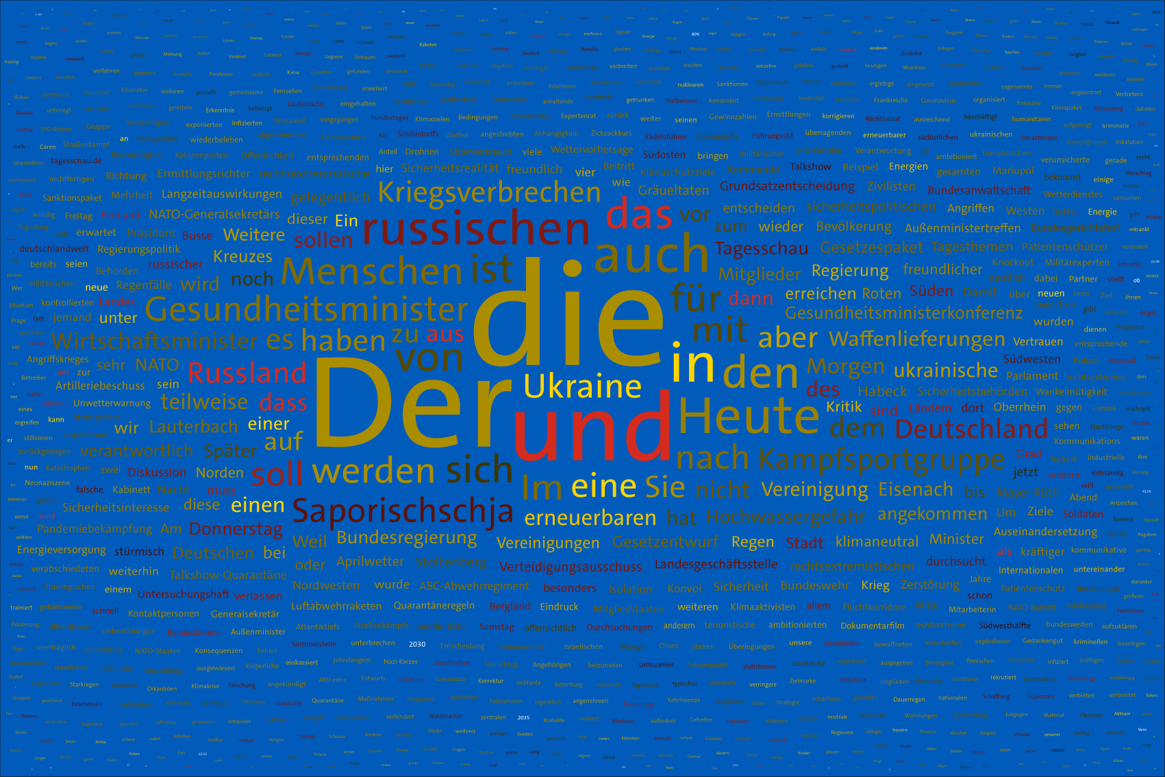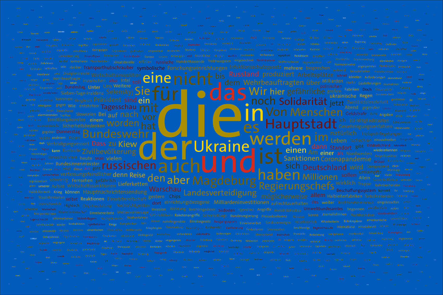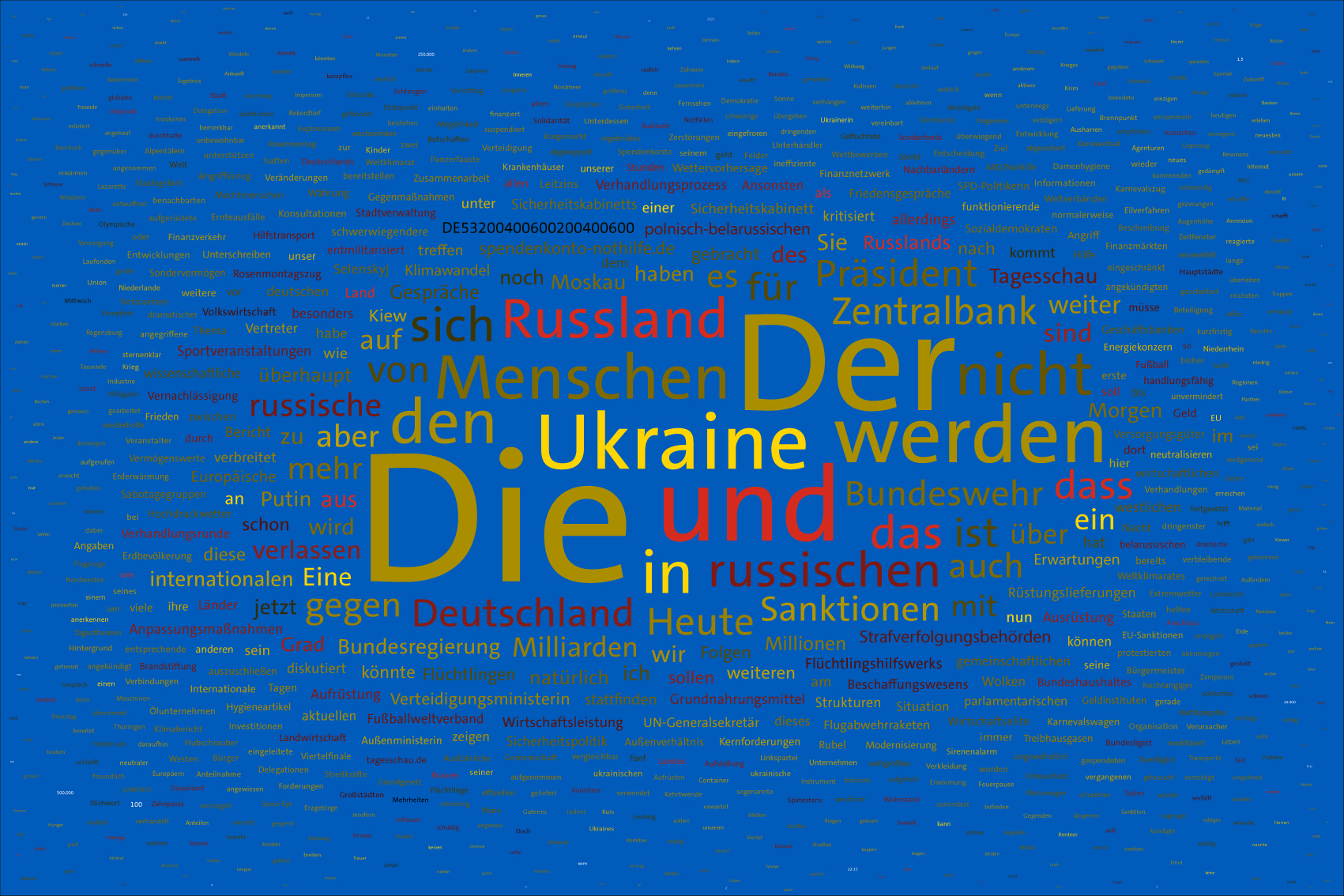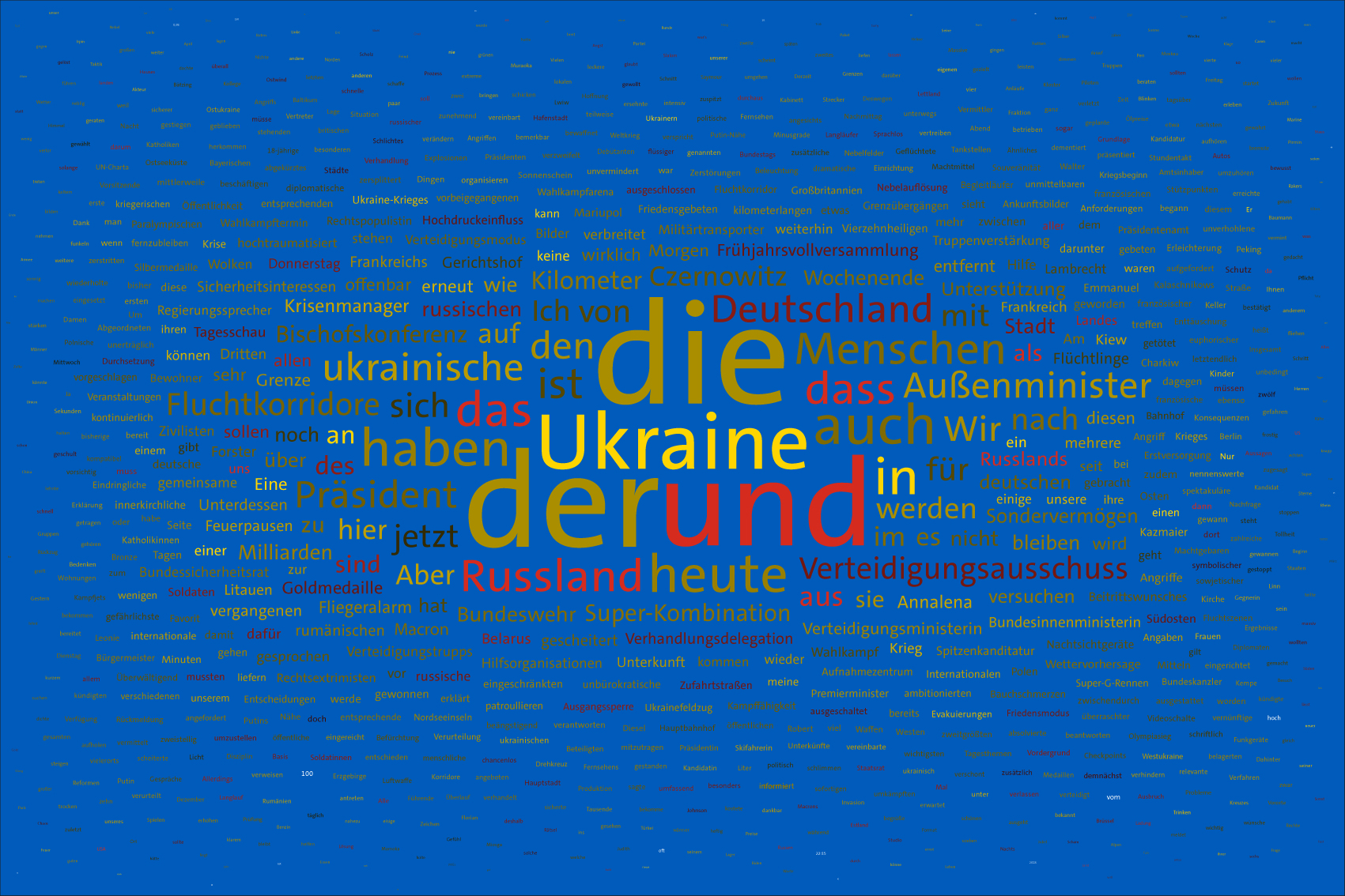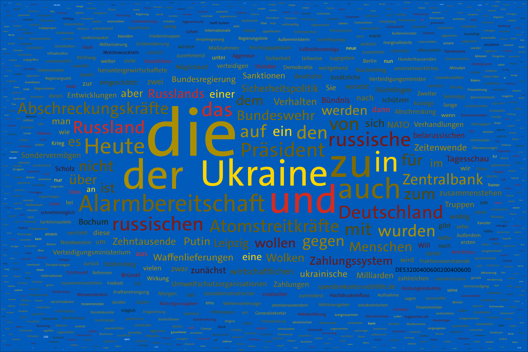 If the word "Ukraine" does not feature in the entire Tagesschau, the word Ukraine is inserted in the size of the first day of the war, the 24th February 2022, but faded out after the grouping of the entire text.