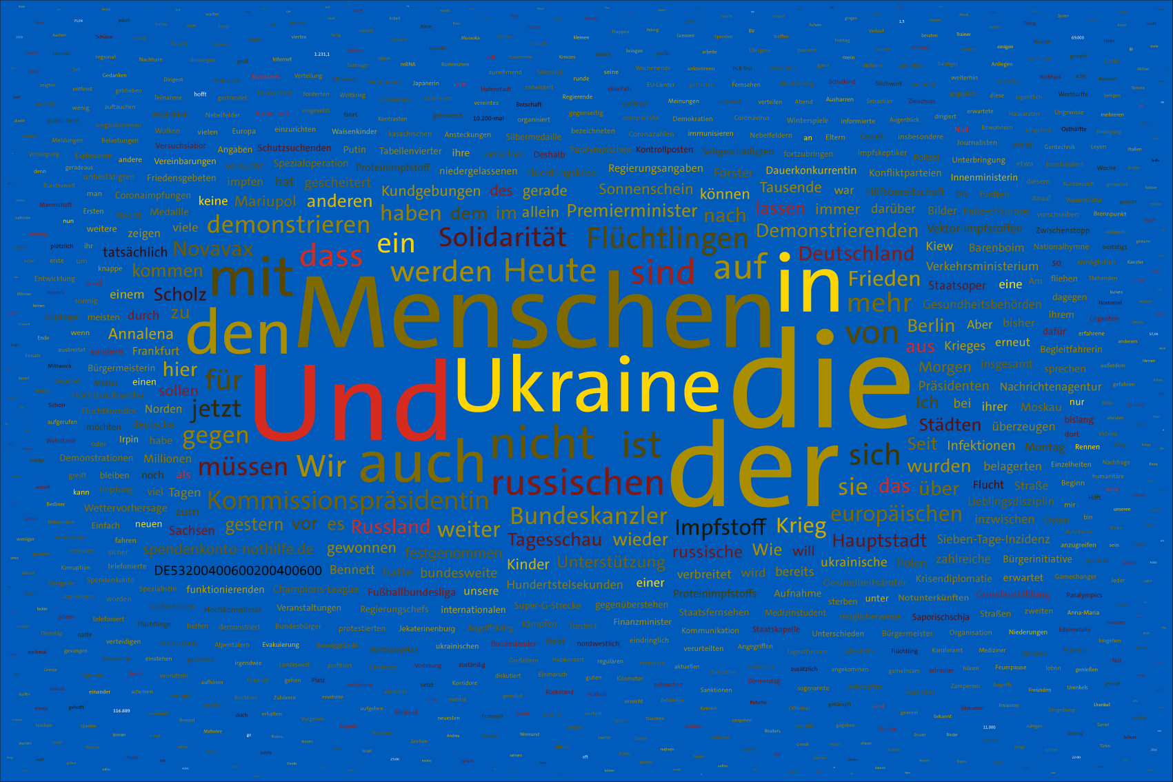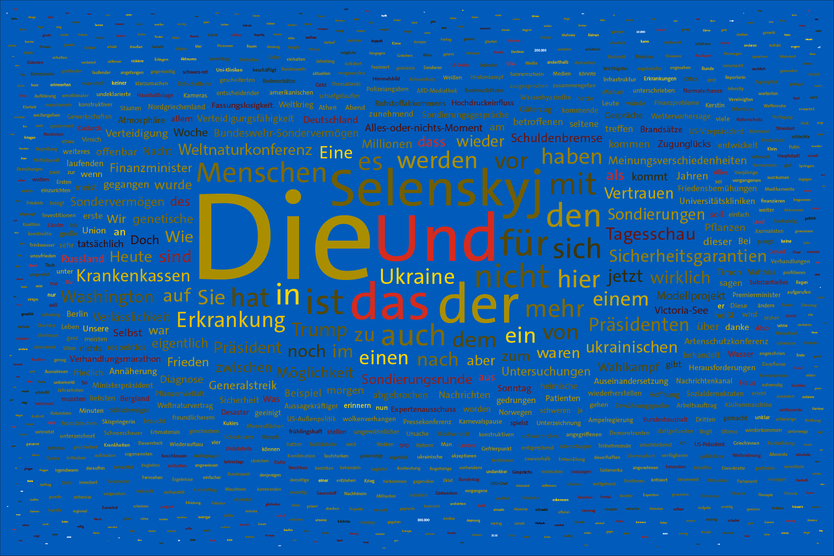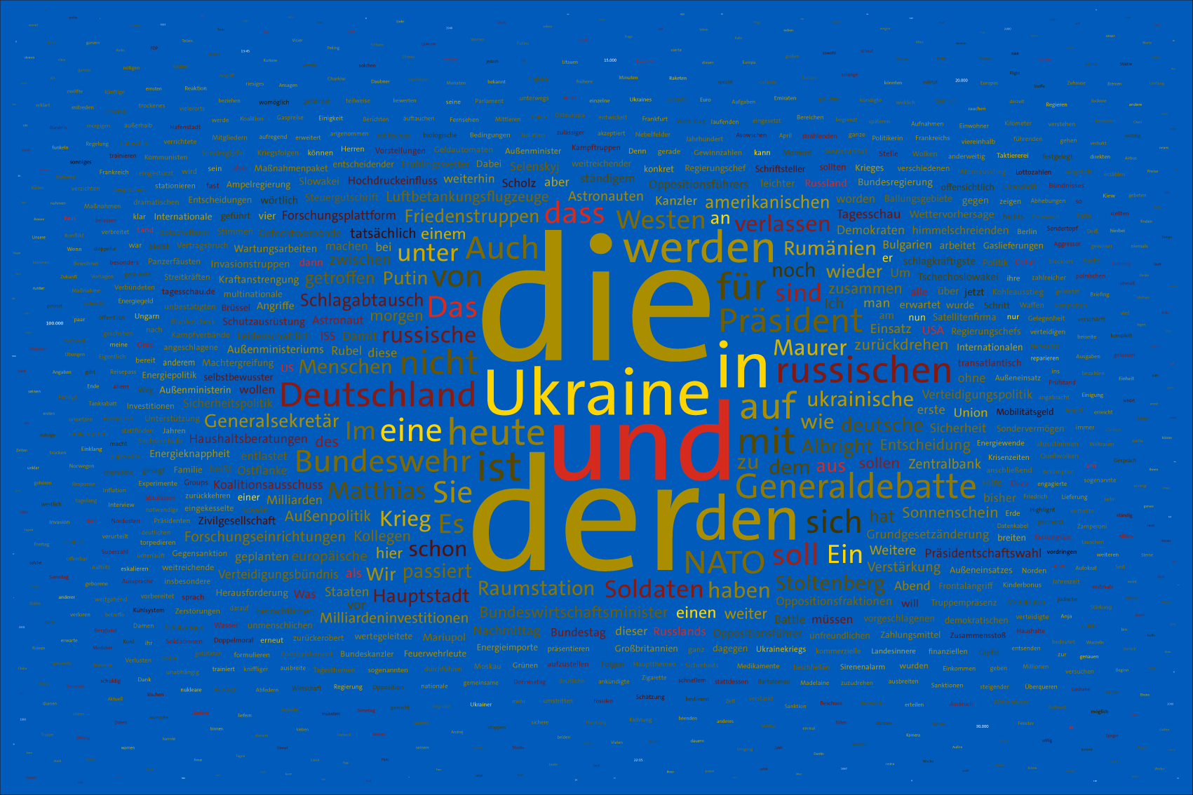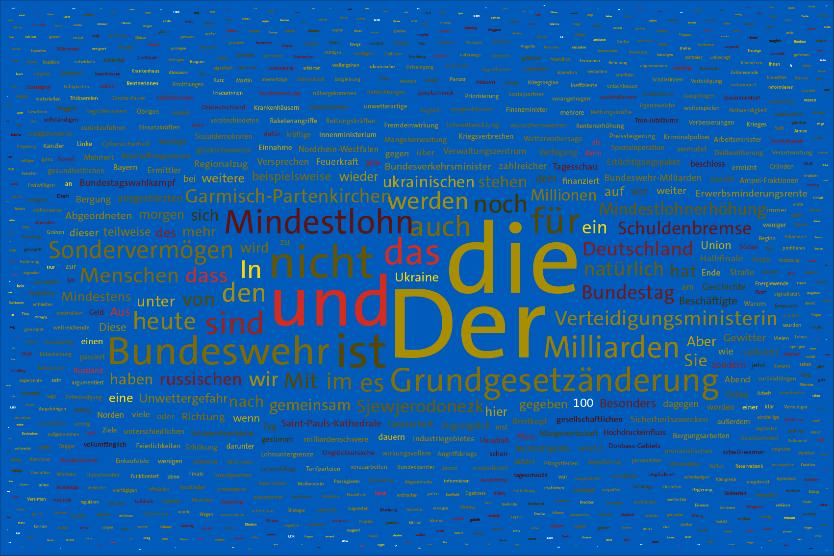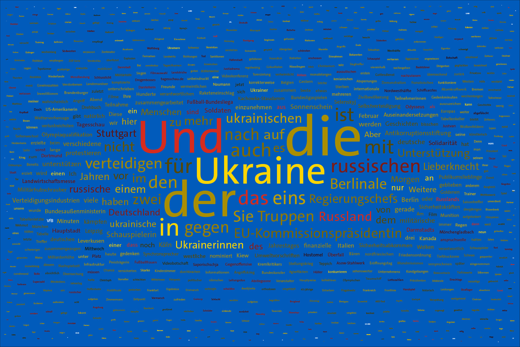 If the word "Ukraine" does not feature in the entire Tagesschau, the word Ukraine is inserted in the size of the first day of the war, the 24th February 2022, but faded out after the grouping of the entire text.