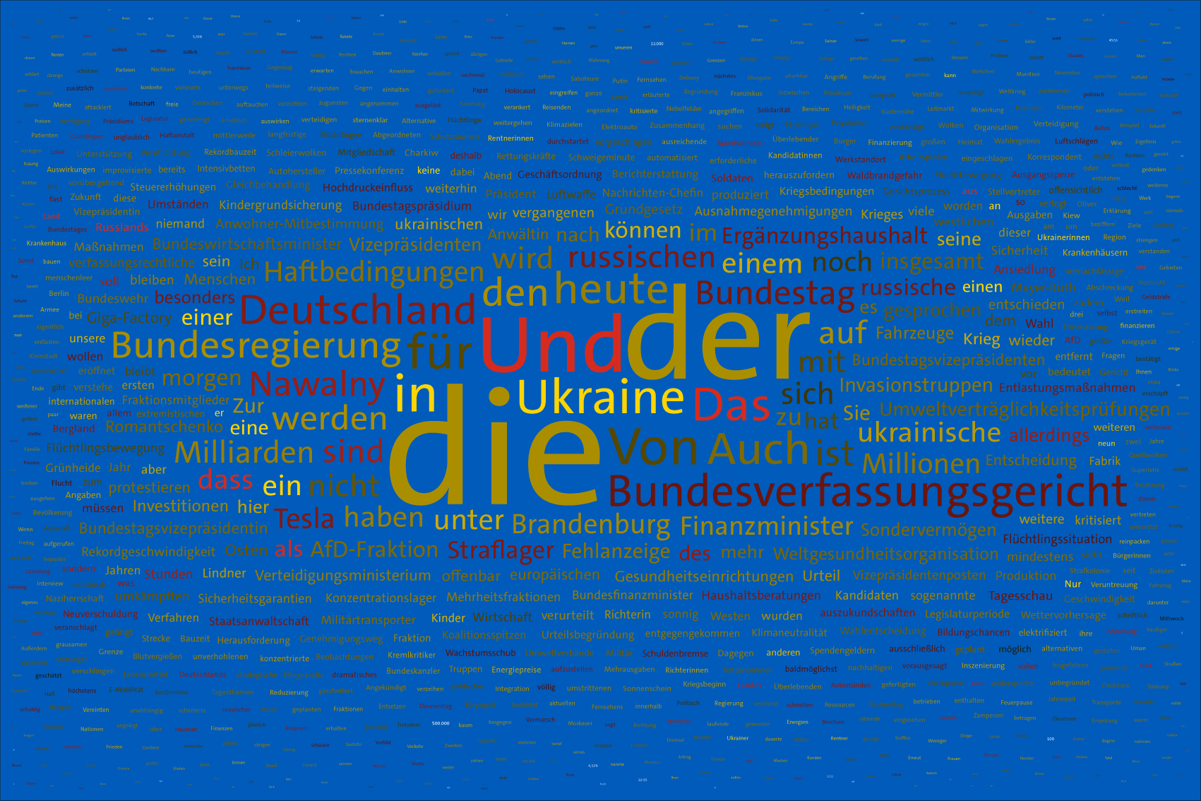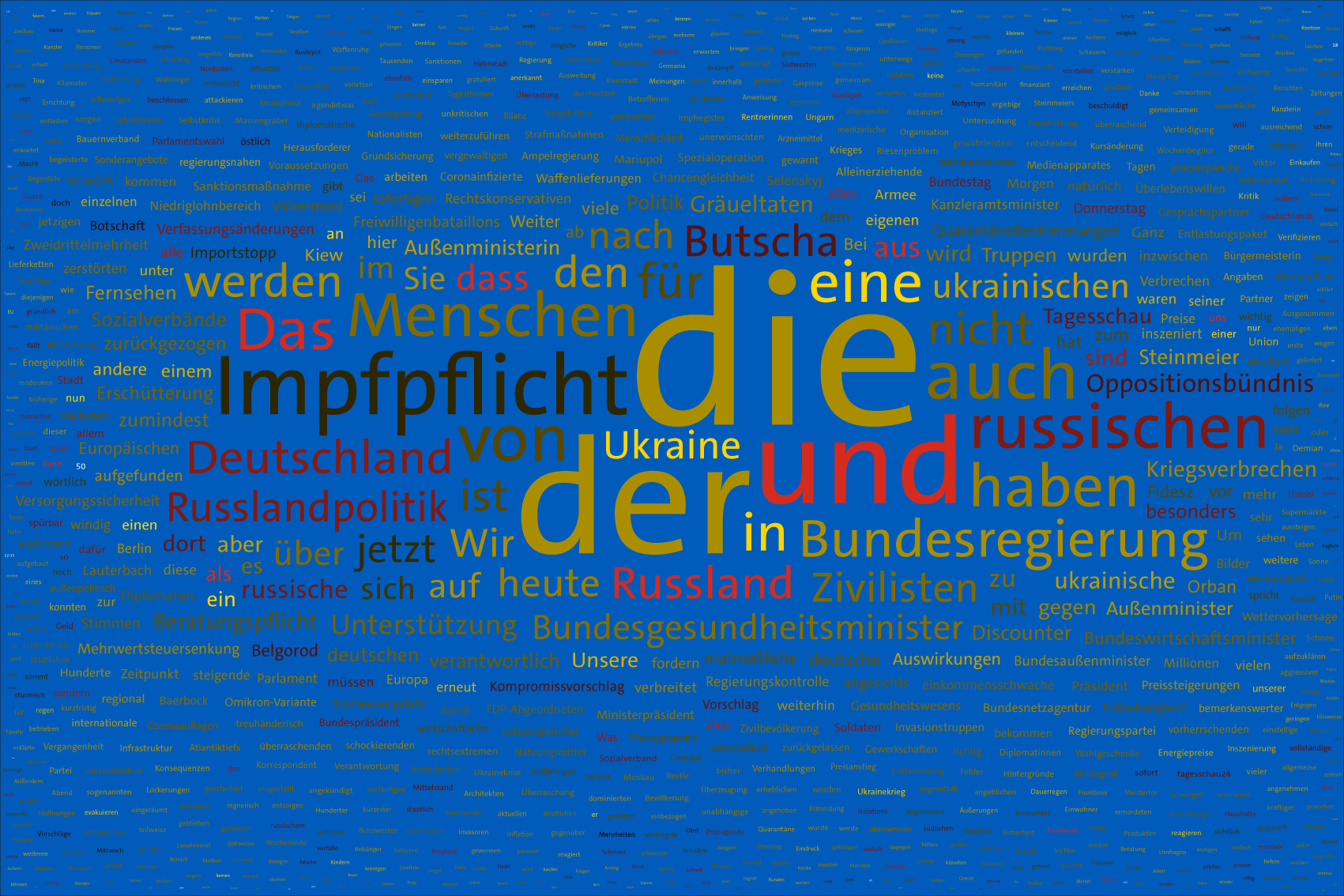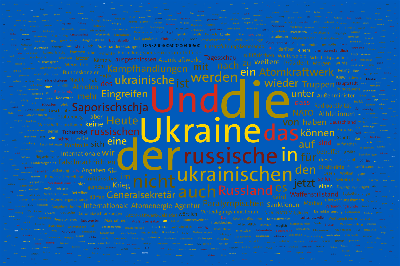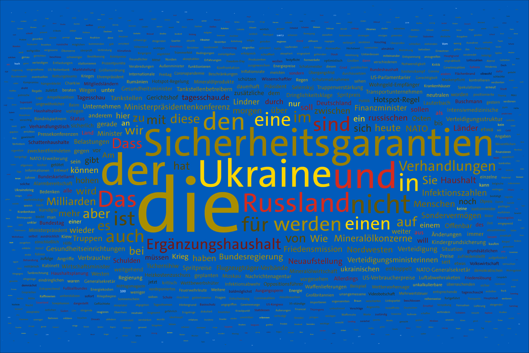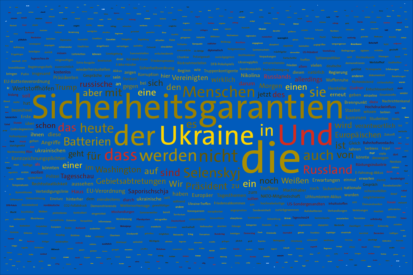 If the word "Ukraine" does not feature in the entire Tagesschau, the word Ukraine is inserted in the size of the first day of the war, the 24th February 2022, but faded out after the grouping of the entire text.