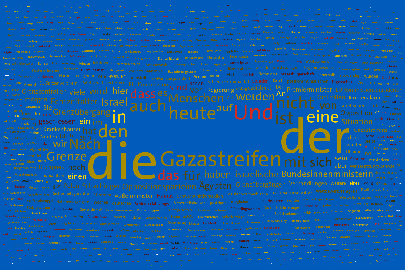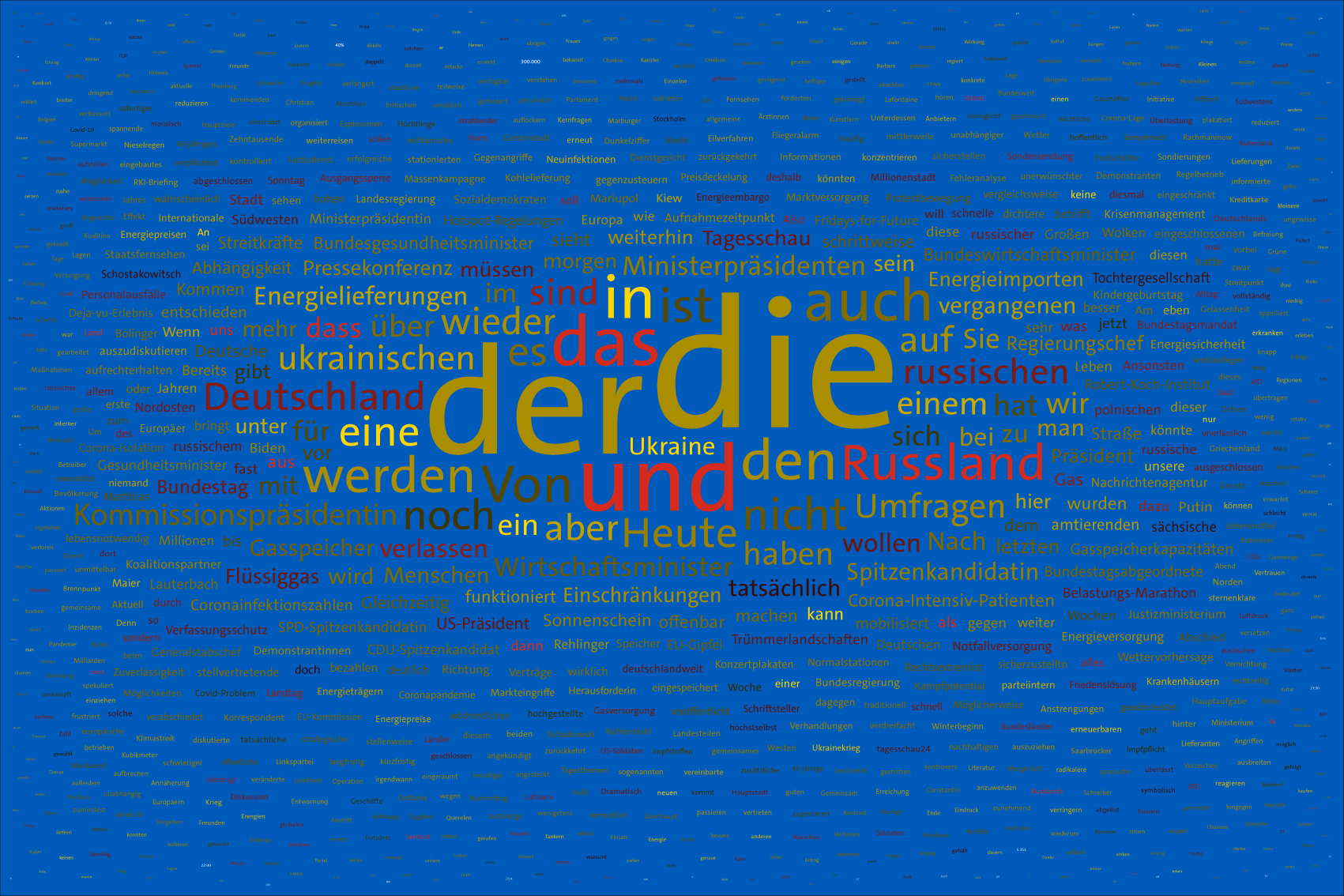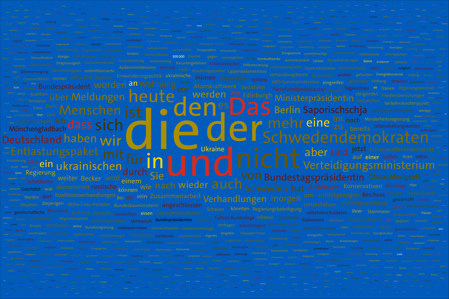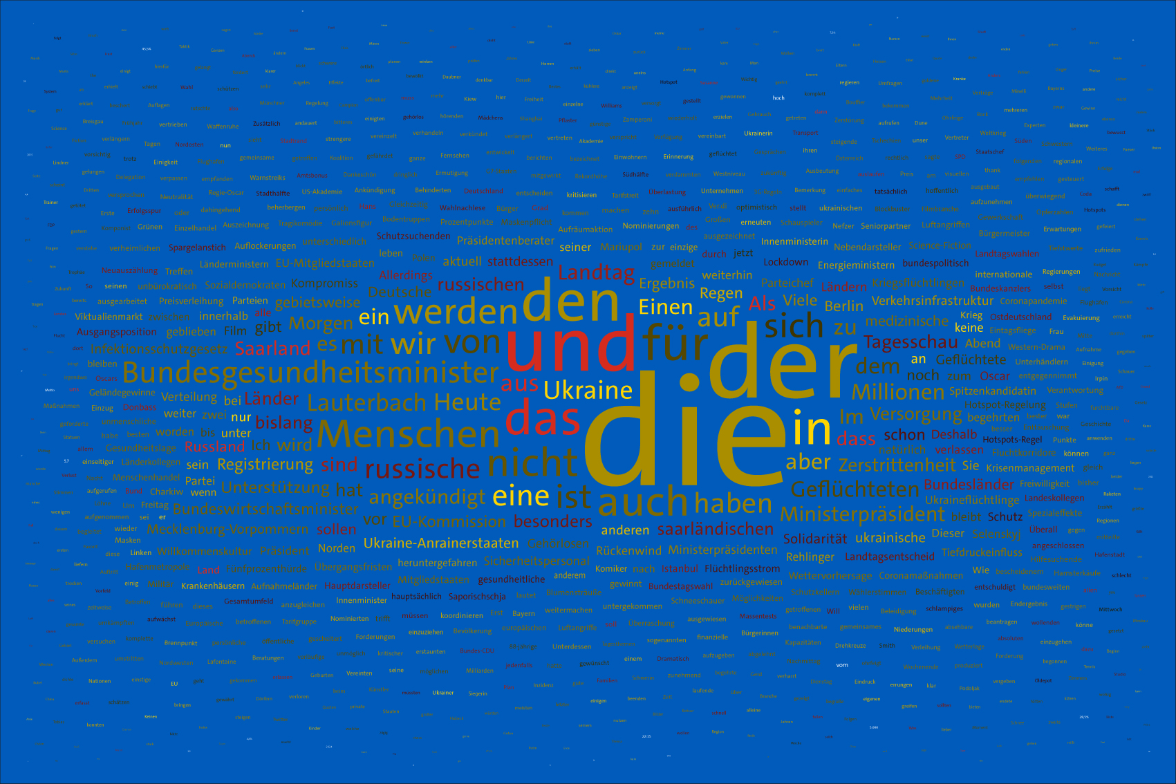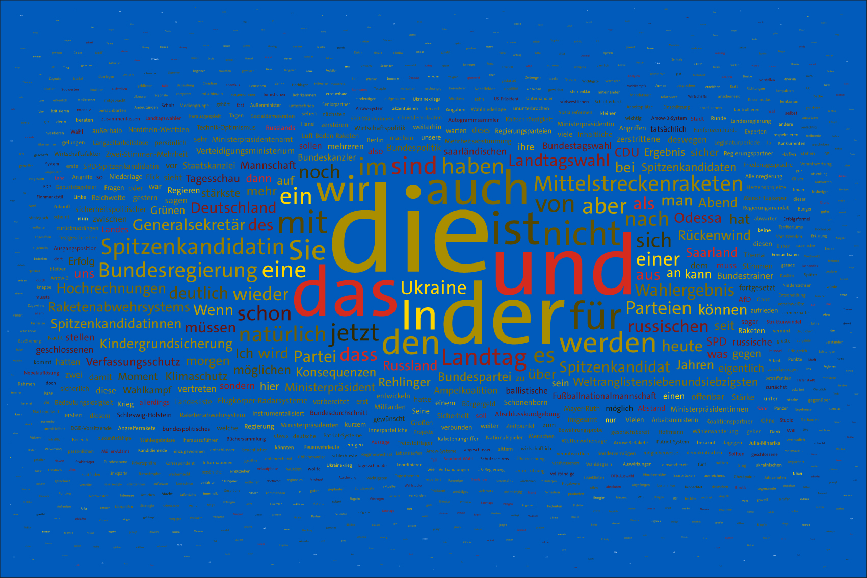 If the word "Ukraine" does not feature in the entire Tagesschau, the word Ukraine is inserted in the size of the first day of the war, the 24th February 2022, but faded out after the grouping of the entire text.