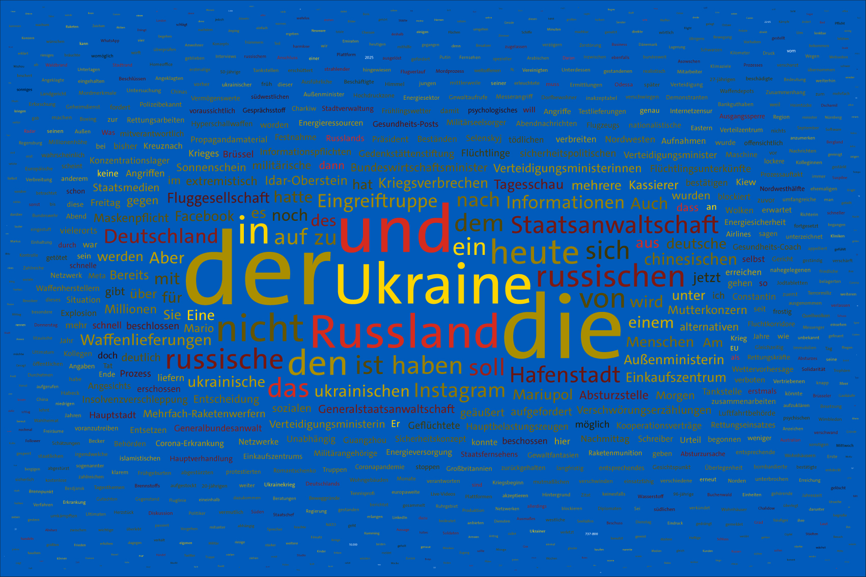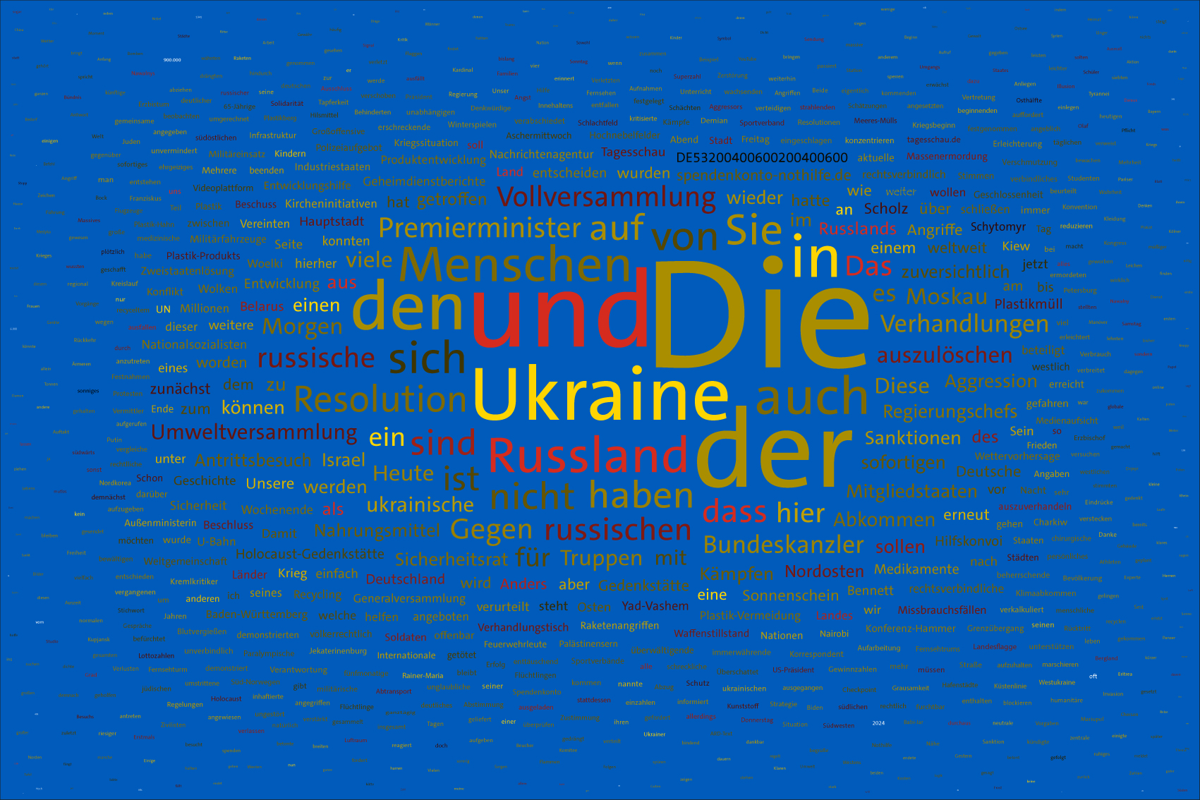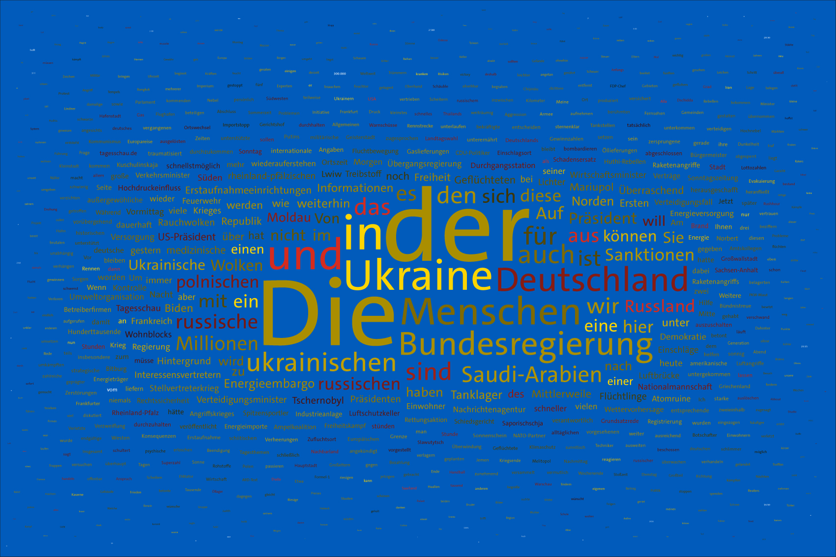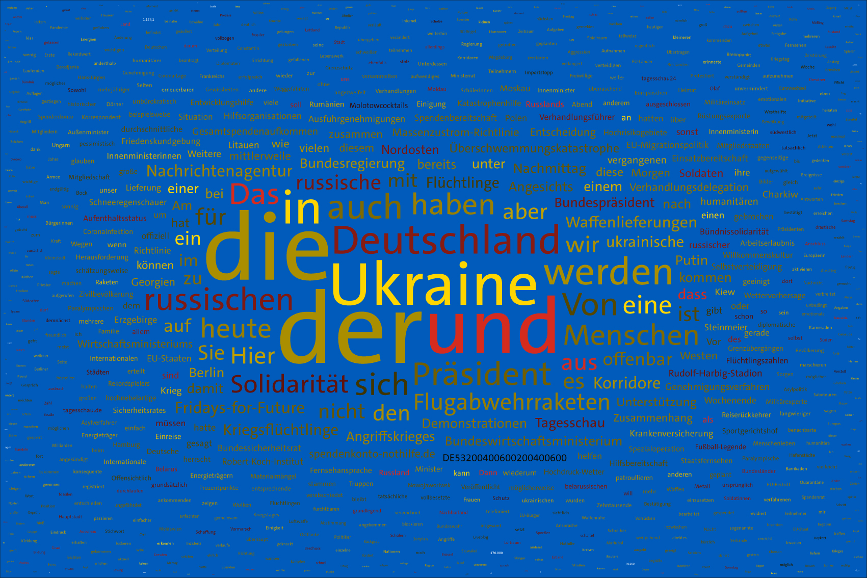 For the font colours, the individual words are assigned to the colour rules for the warring parties. For this purpose, the number of occurrences of the letters of the country names of the warring parties in the respective word is counted. For the Ukraine, the occurrences of the letters u, k, r, a, i, n, e, for the aggressor Russia the letters r, u, s, l, a, n, d (the s is only counted once) are evaluated. The word is assigned to the colour rule that scores the higher value. In case of a tie, the rule for Ukraine is applied. If there is no letter of the warring parties, the value is white (FFFFFF).