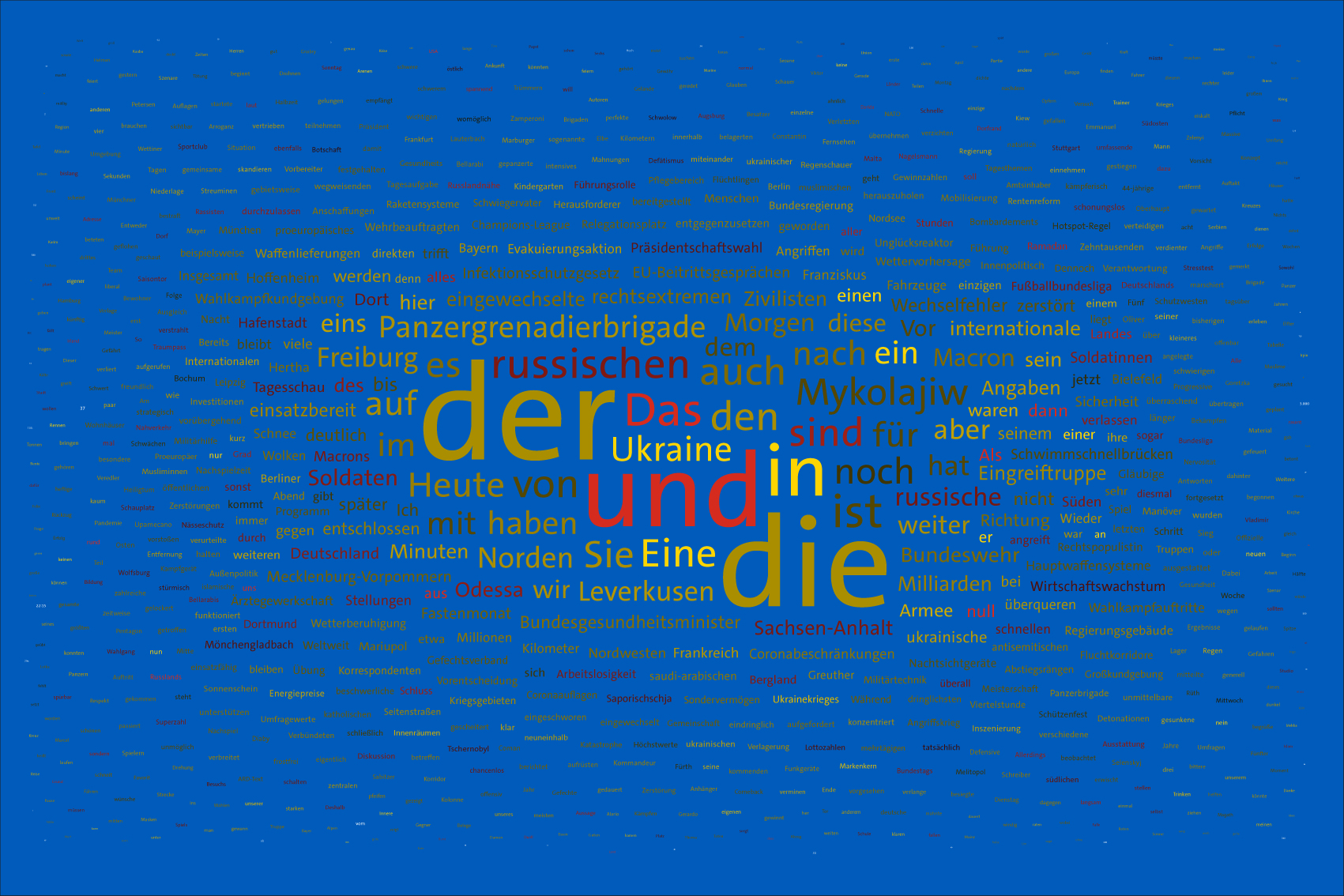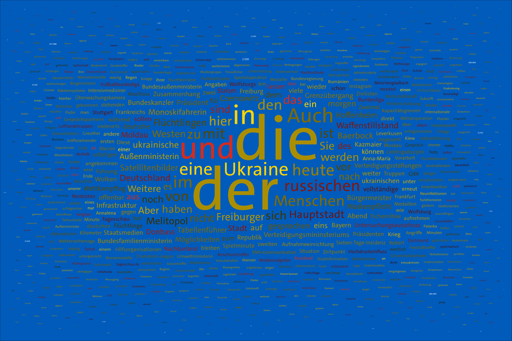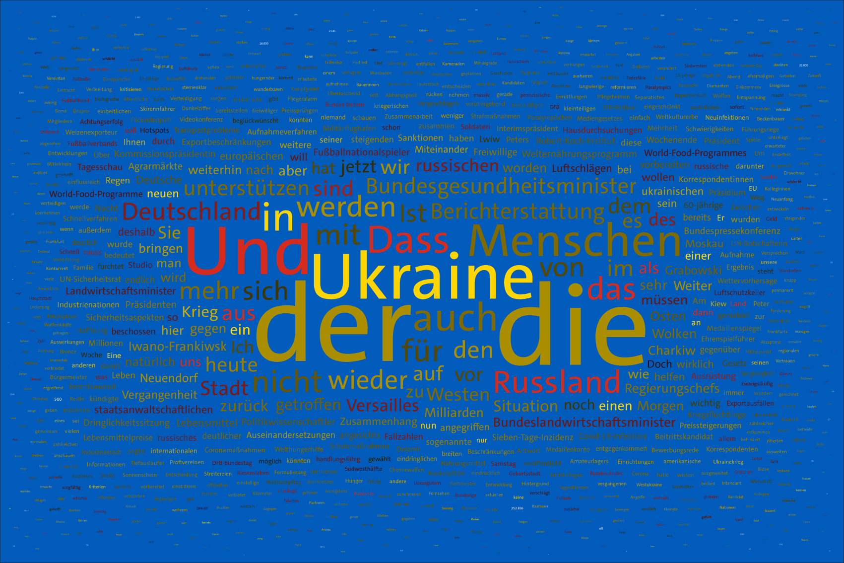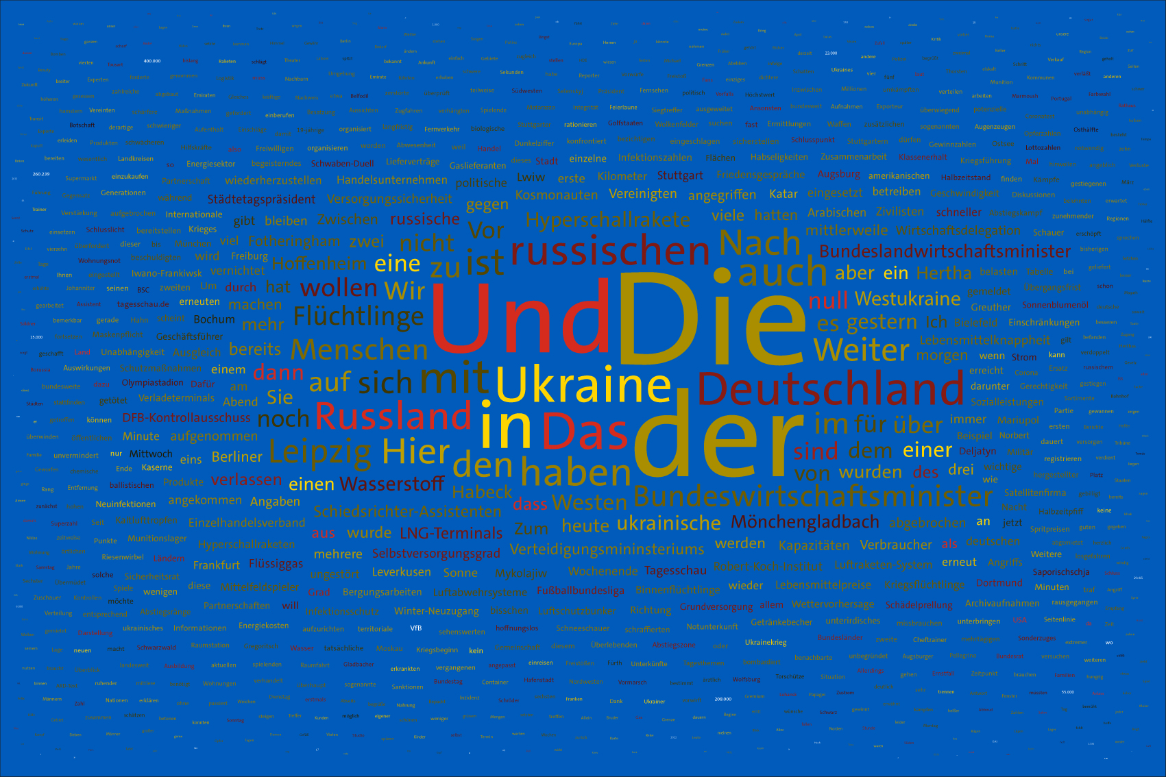 For the font colours, the individual words are assigned to the colour rules for the warring parties. For this purpose, the number of occurrences of the letters of the country names of the warring parties in the respective word is counted. For the Ukraine, the occurrences of the letters u, k, r, a, i, n, e, for the aggressor Russia the letters r, u, s, l, a, n, d (the s is only counted once) are evaluated. The word is assigned to the colour rule that scores the higher value. In case of a tie, the rule for Ukraine is applied. If there is no letter of the warring parties, the value is white (FFFFFF).