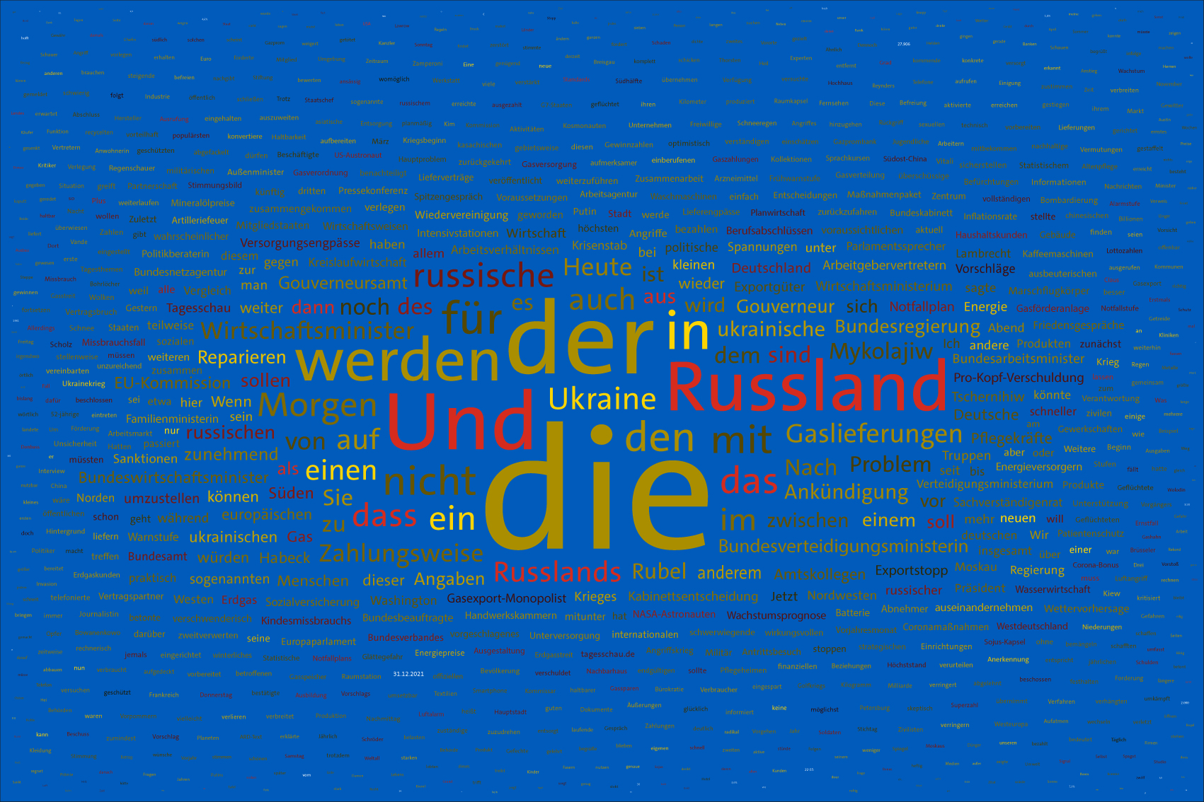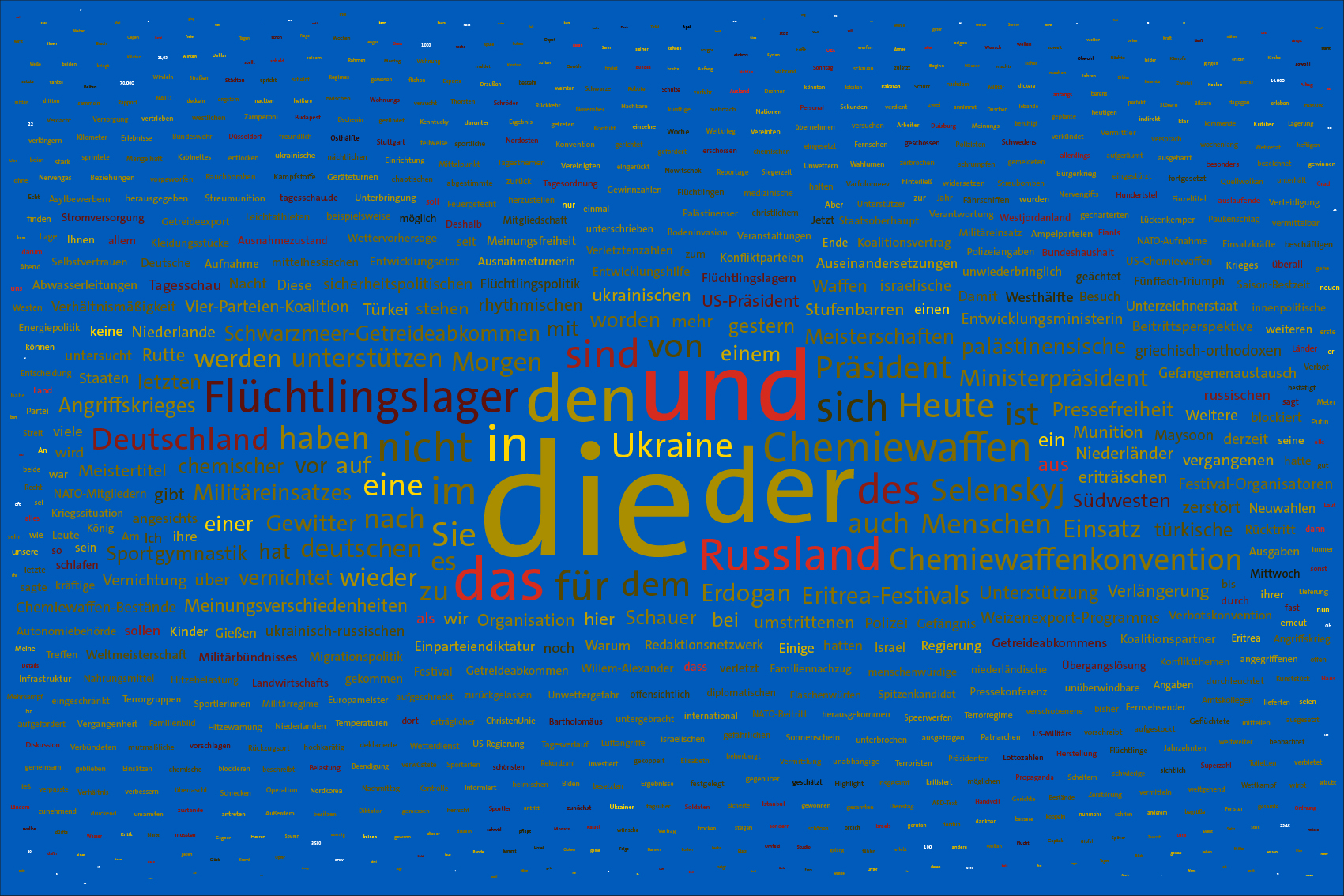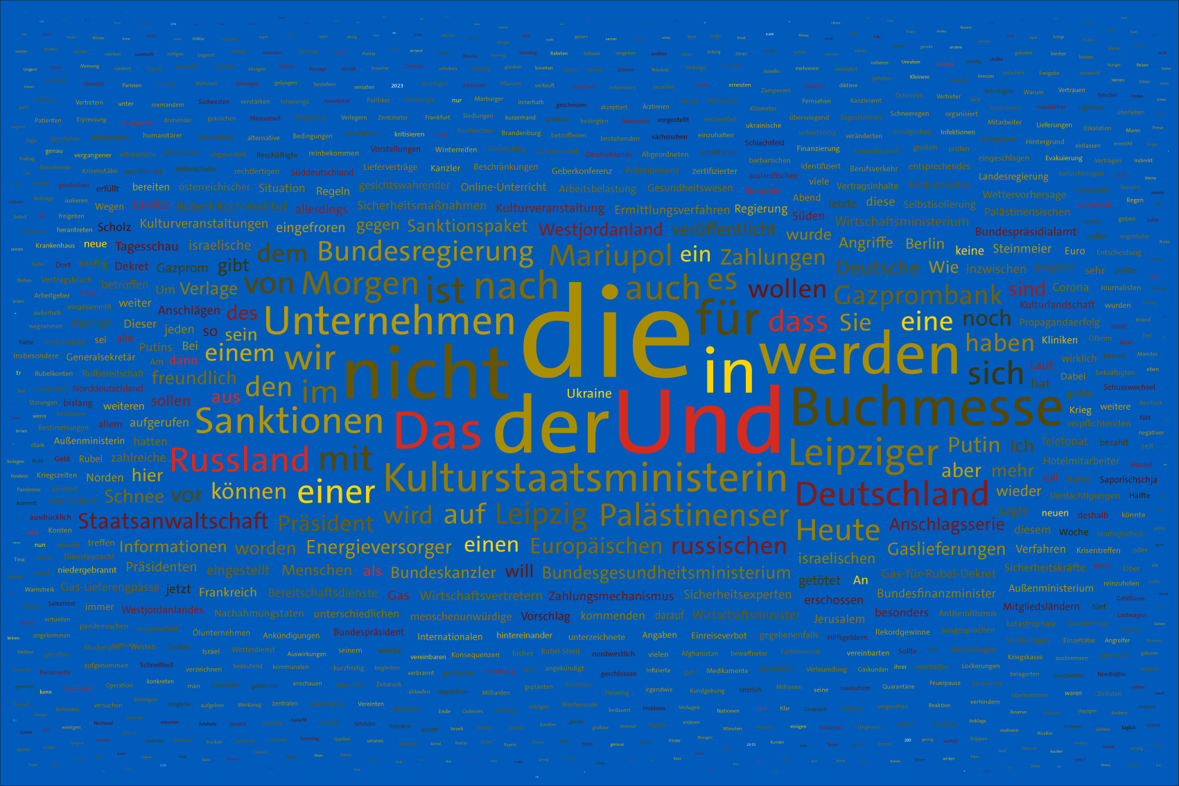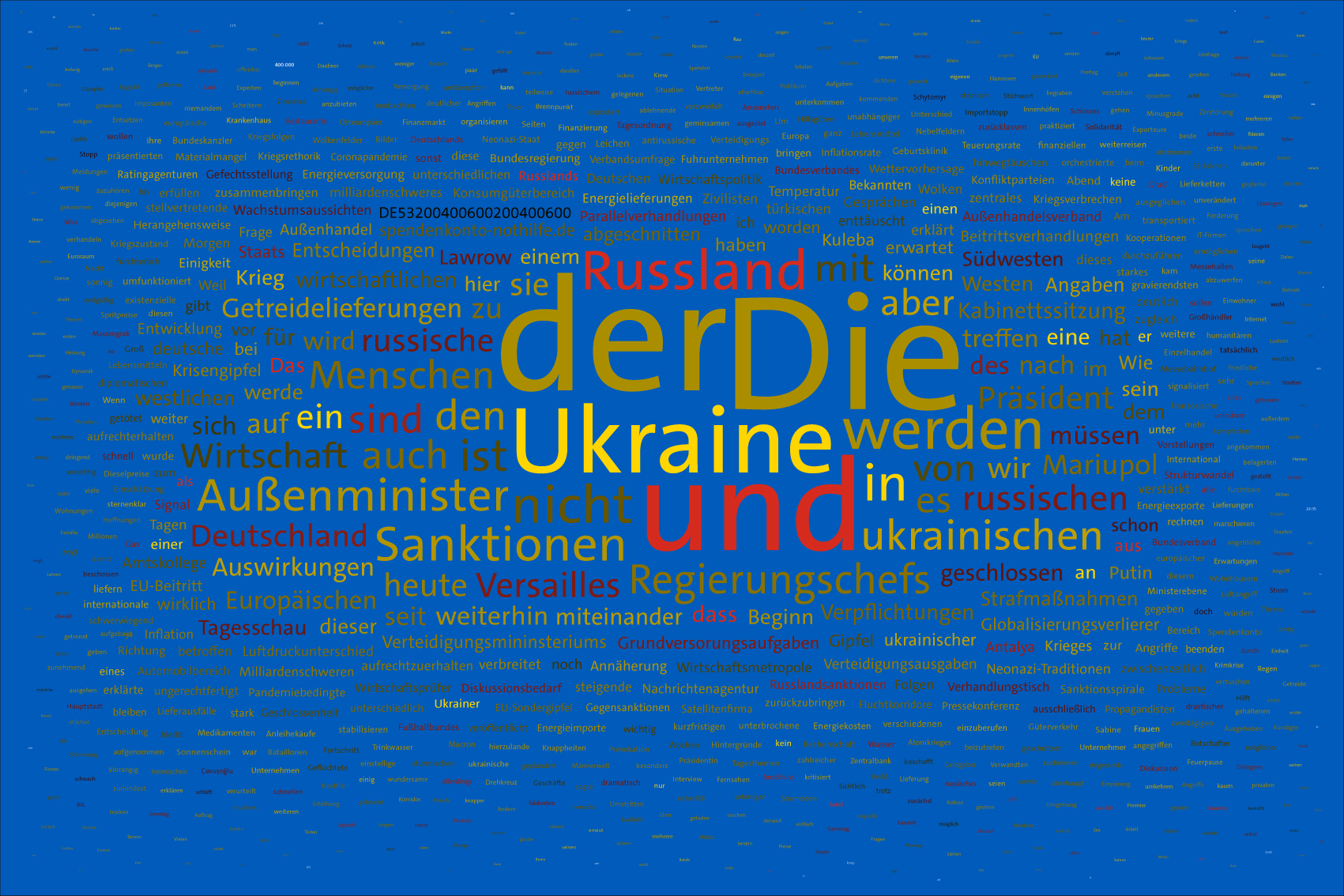 For the font colours, the individual words are assigned to the colour rules for the warring parties. For this purpose, the number of occurrences of the letters of the country names of the warring parties in the respective word is counted. For the Ukraine, the occurrences of the letters u, k, r, a, i, n, e, for the aggressor Russia the letters r, u, s, l, a, n, d (the s is only counted once) are evaluated. The word is assigned to the colour rule that scores the higher value. In case of a tie, the rule for Ukraine is applied. If there is no letter of the warring parties, the value is white (FFFFFF).