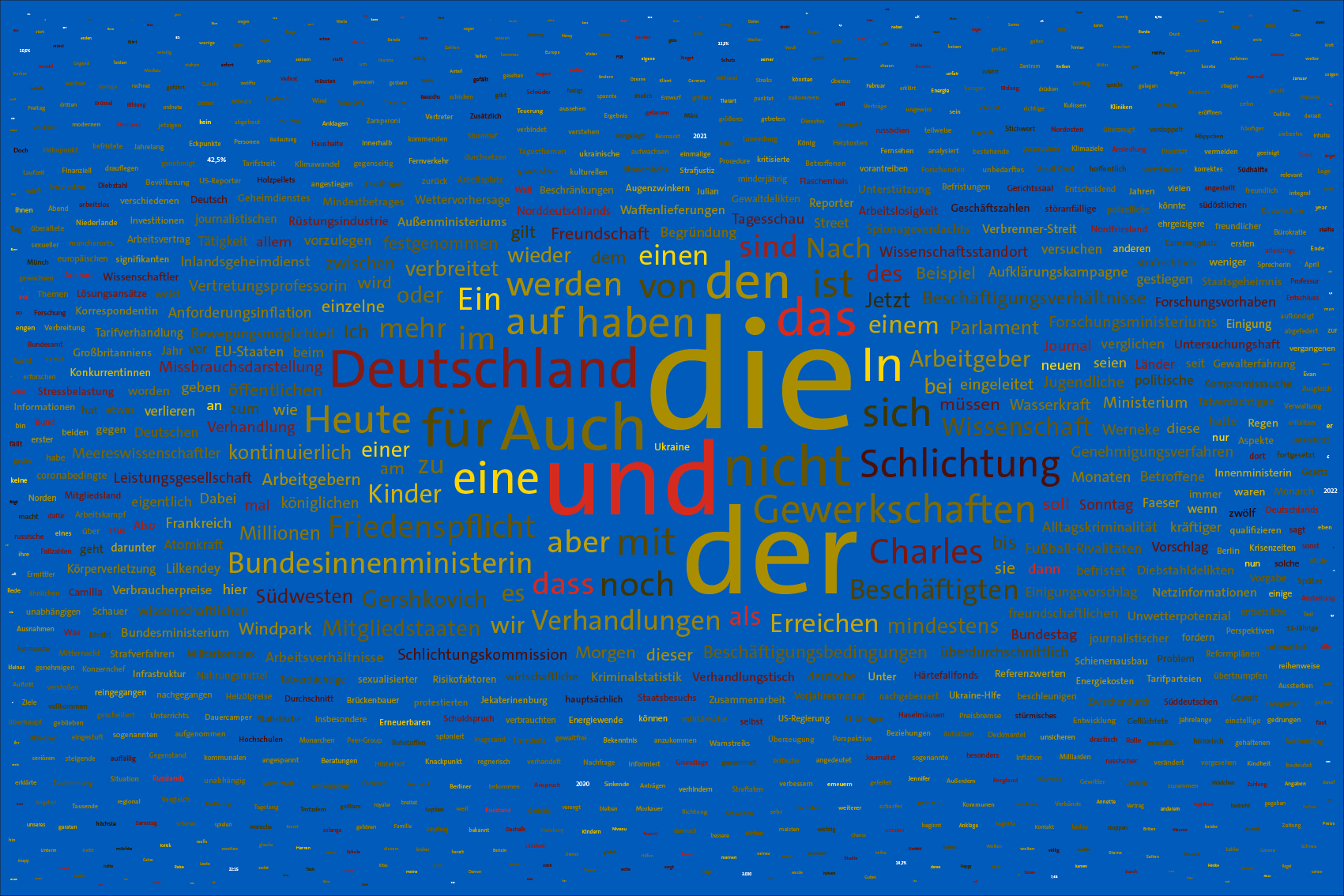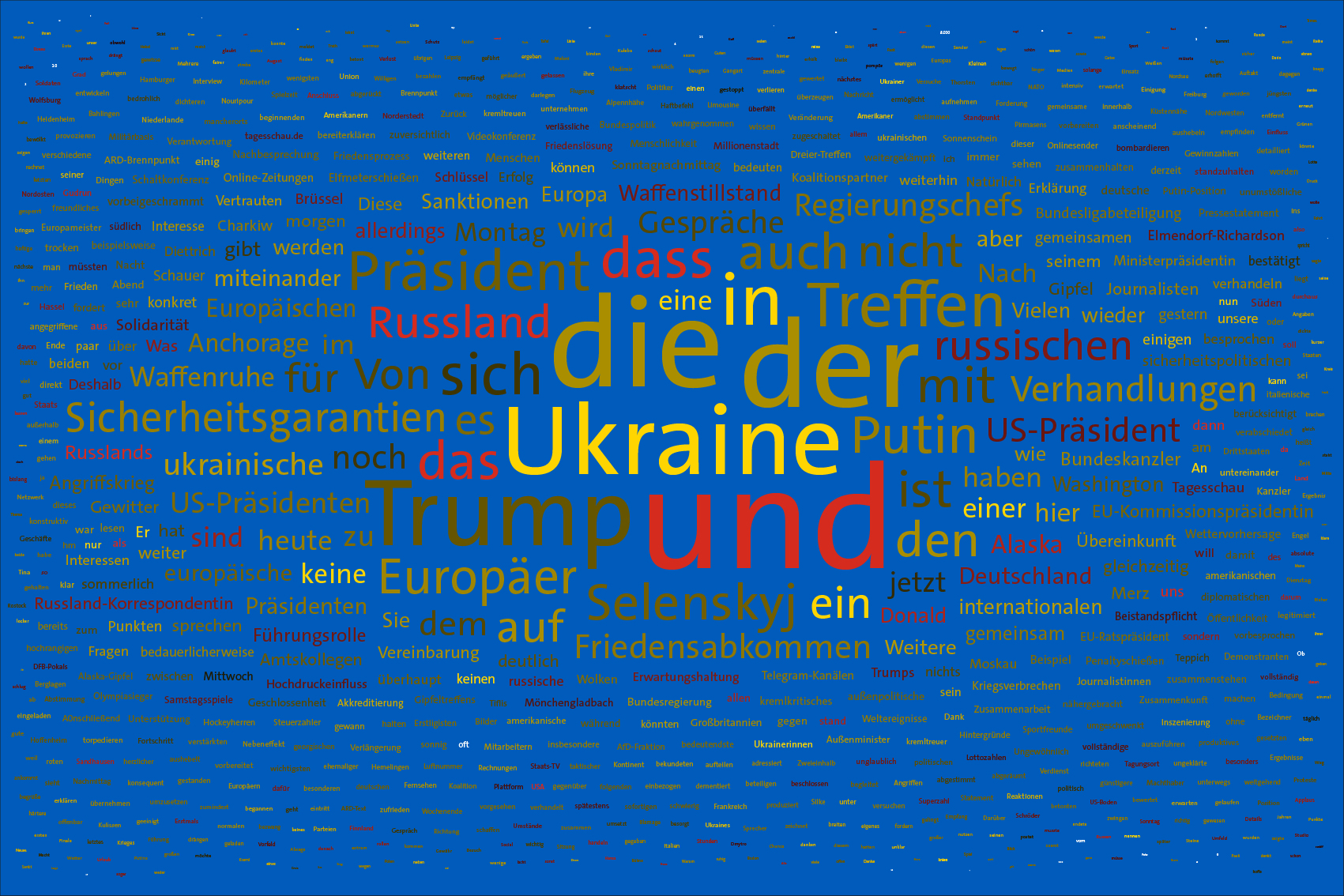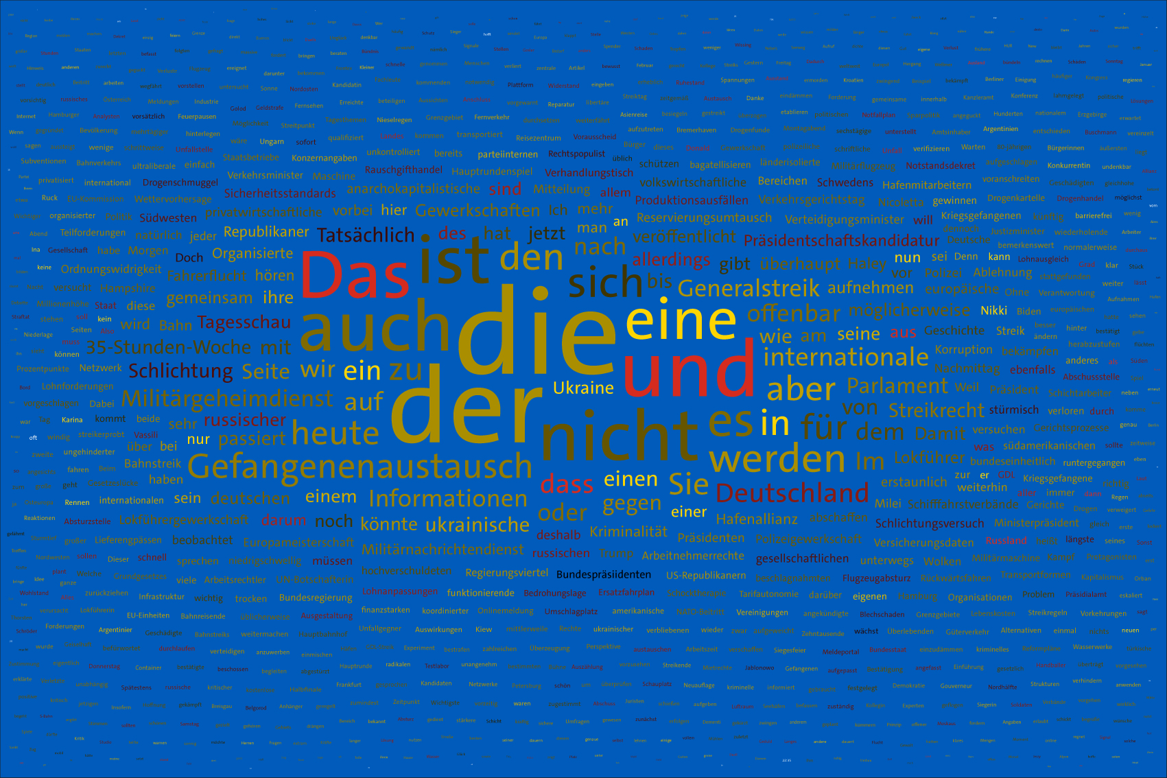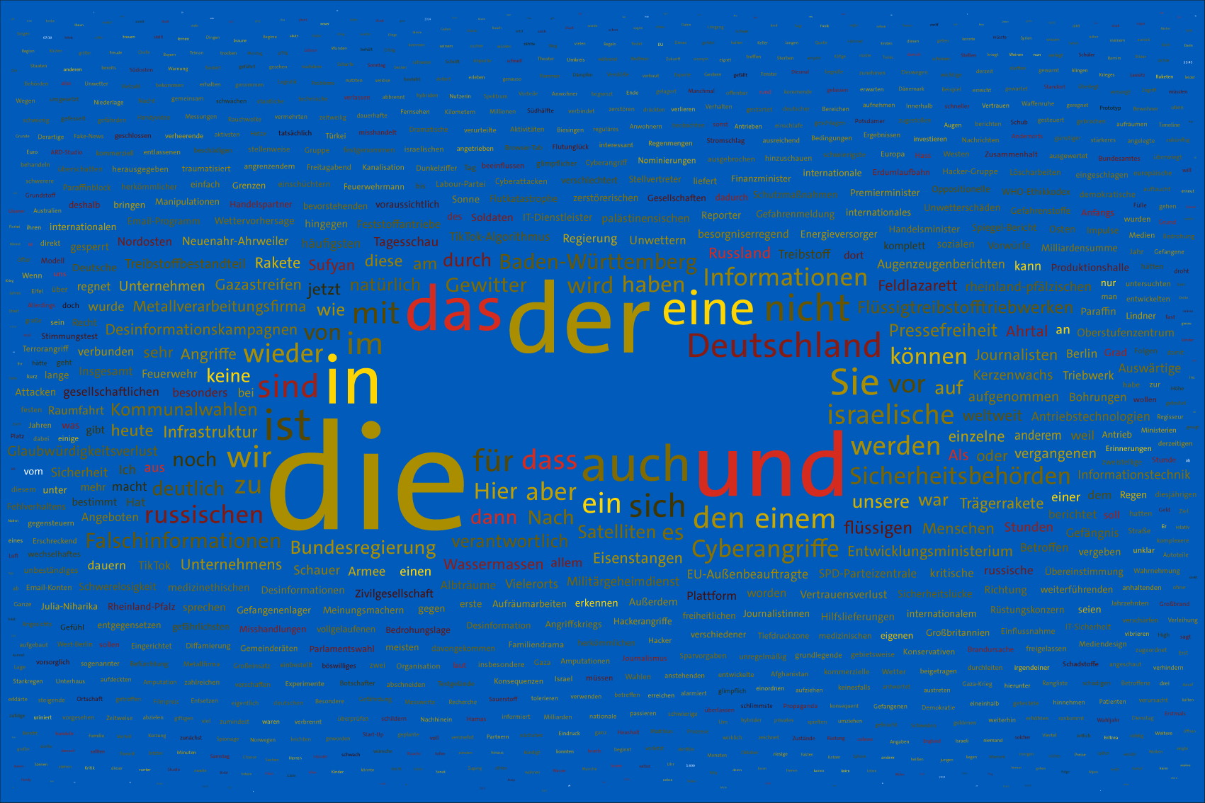 For the font colours, the individual words are assigned to the colour rules for the warring parties. For this purpose, the number of occurrences of the letters of the country names of the warring parties in the respective word is counted. For the Ukraine, the occurrences of the letters u, k, r, a, i, n, e, for the aggressor Russia the letters r, u, s, l, a, n, d (the s is only counted once) are evaluated. The word is assigned to the colour rule that scores the higher value. In case of a tie, the rule for Ukraine is applied. If there is no letter of the warring parties, the value is white (FFFFFF).